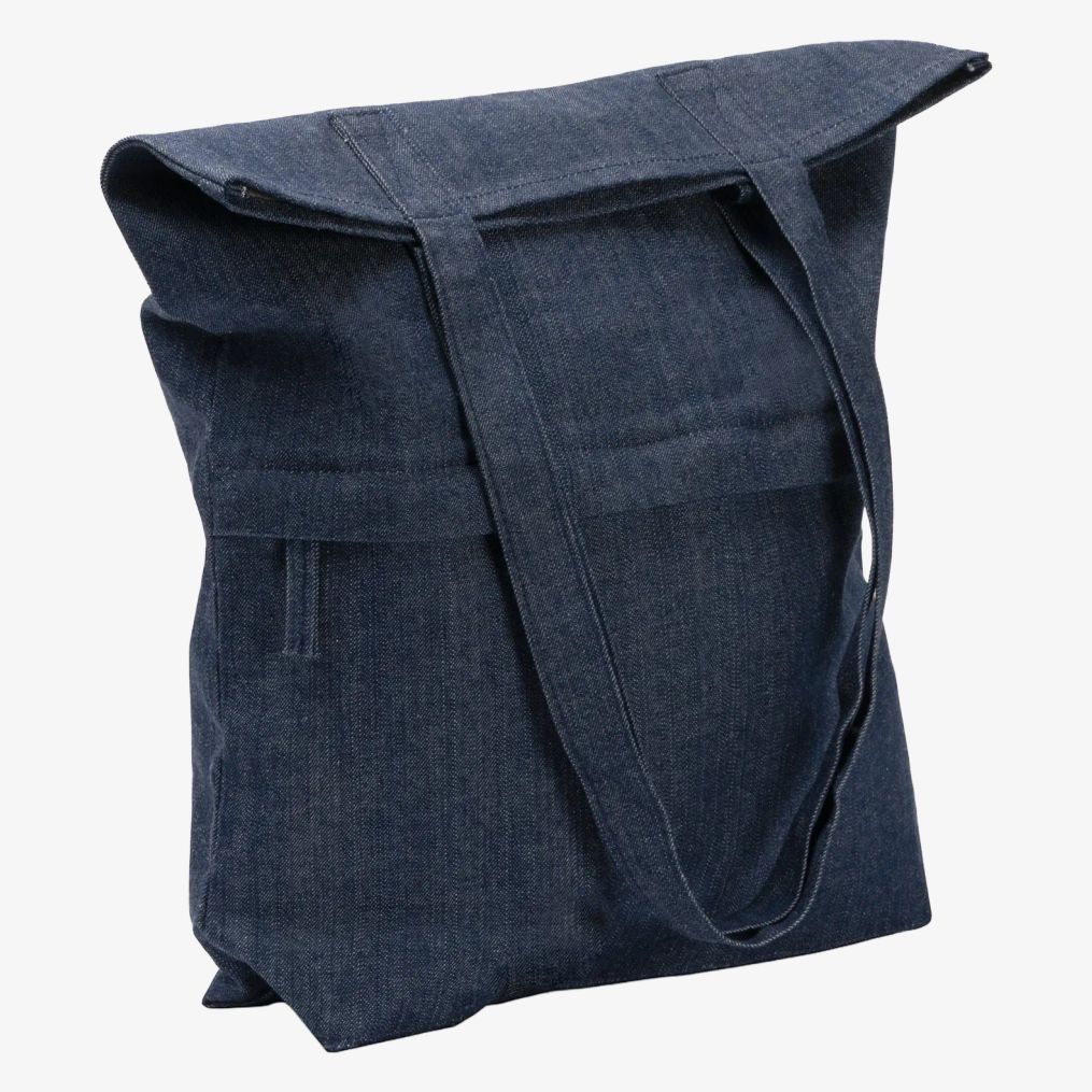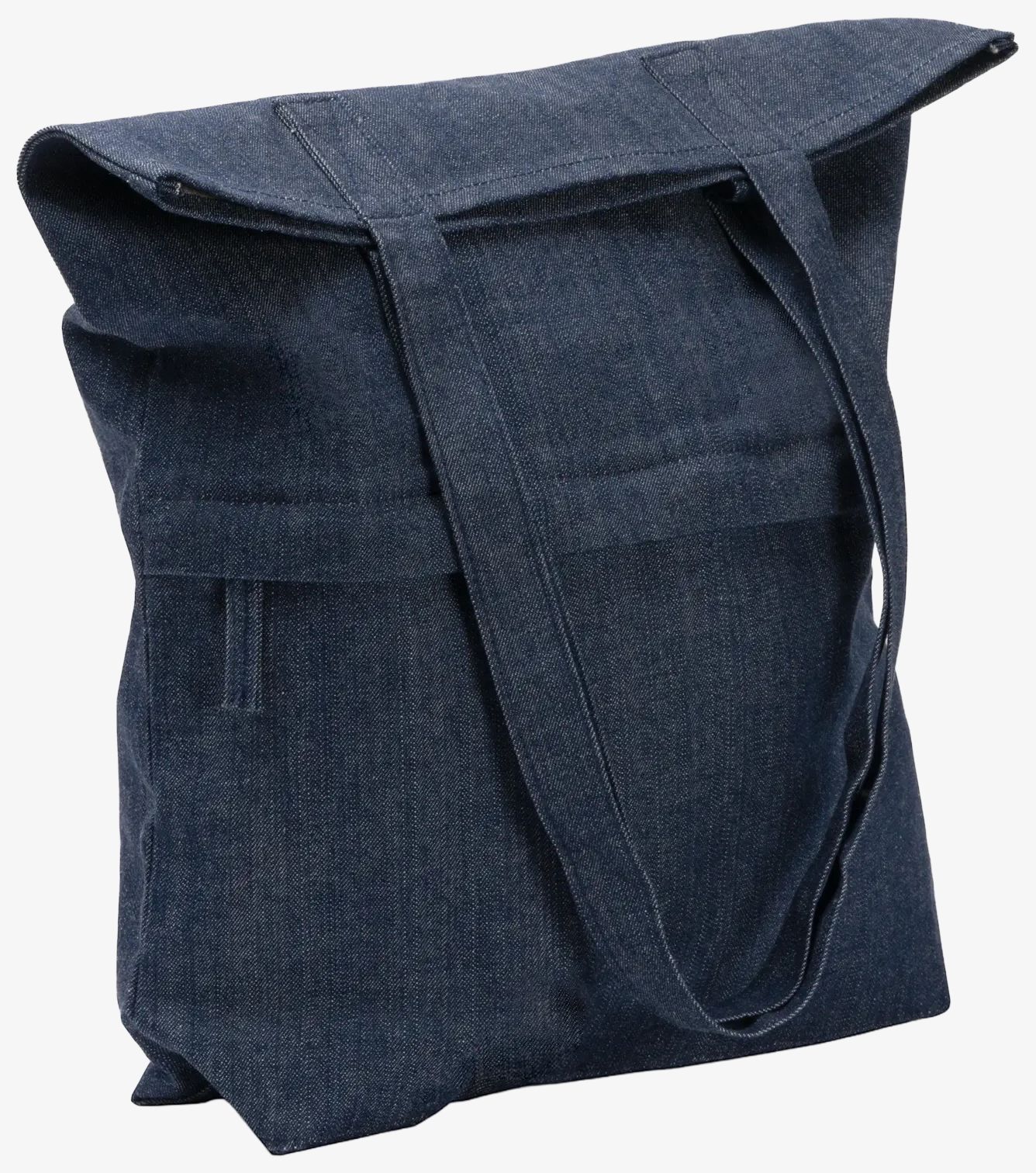 The recycled denim shopping bag includes a front zipper pocket and long 70 cm straps. This bag features suitable dimensions for various uses.