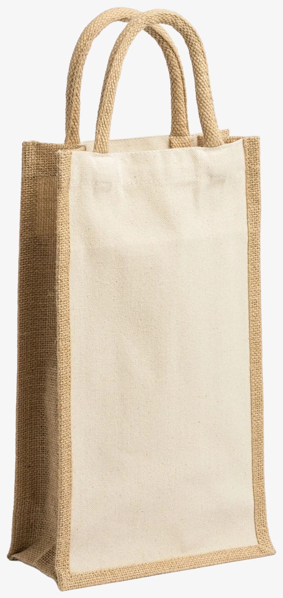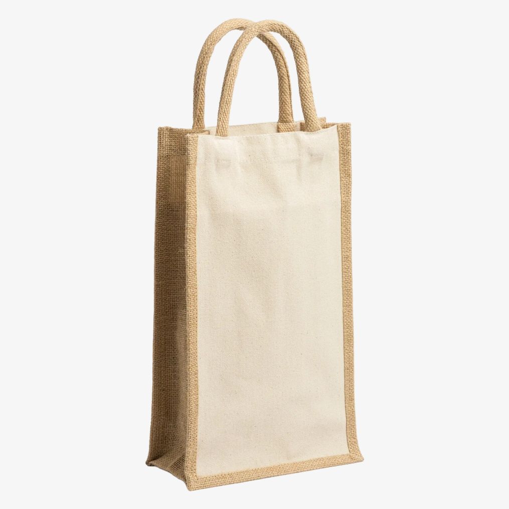 The jute and cotton shopping bag features a double compartment and reinforced handles. Suitable for carrying two bottles.