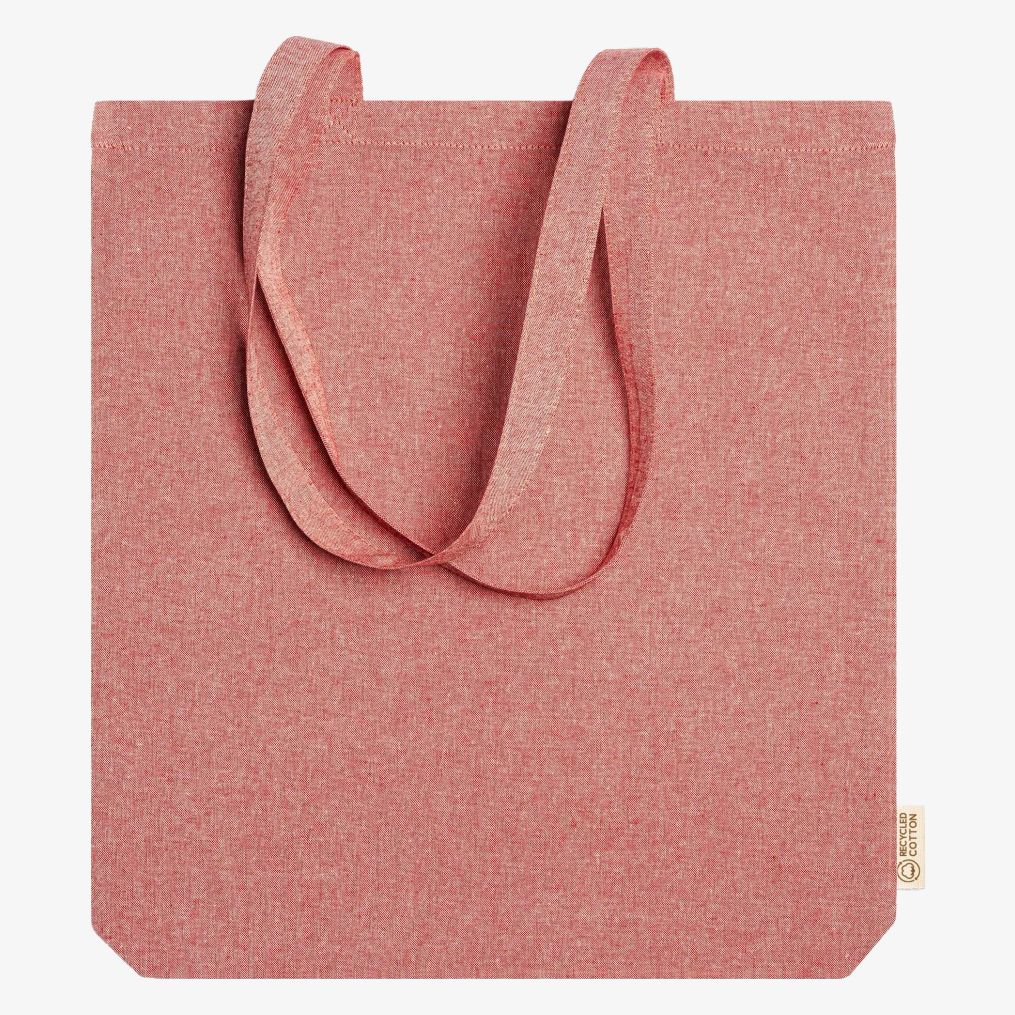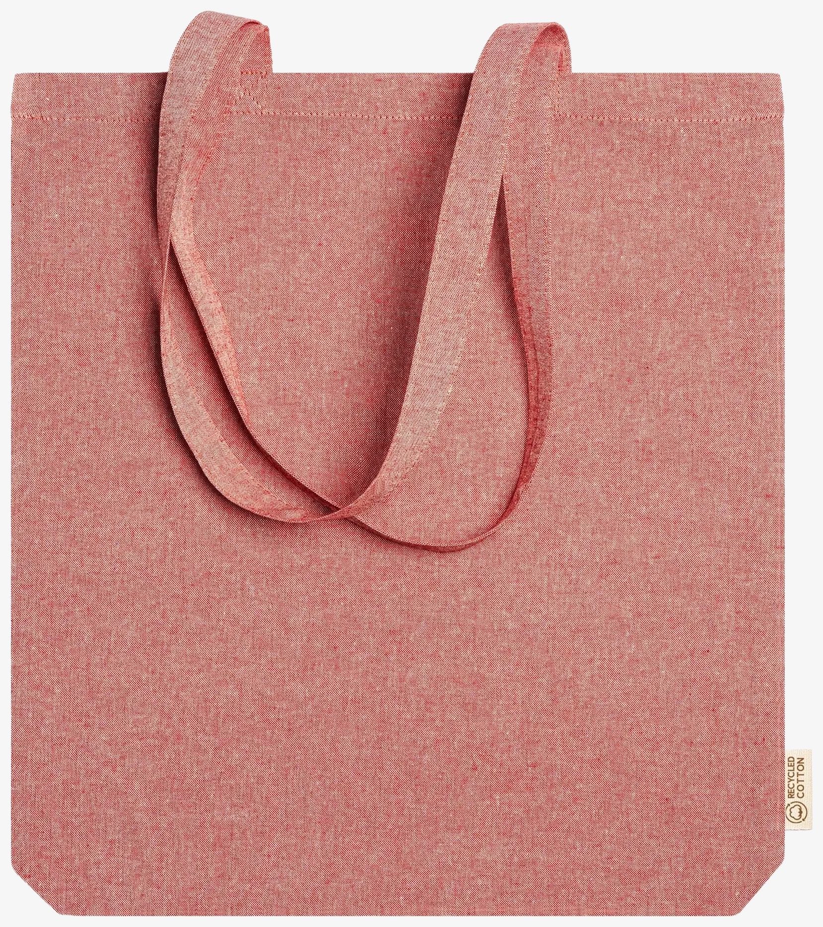 The recycled cotton bag features a heathered design with 70 cm long handles. It offers a suitable volume to carry various items in a manageable size.