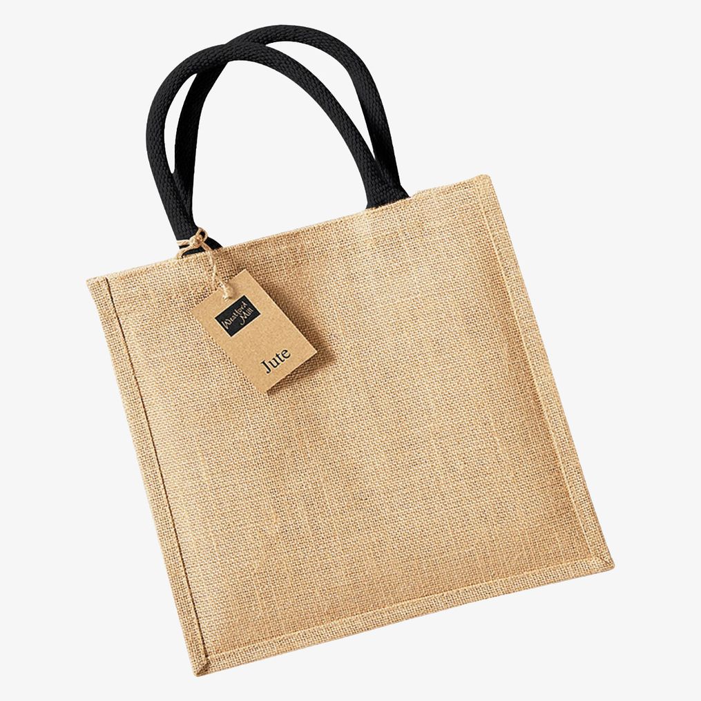 The Sac cadeau jute midi is suitable for carrying everyday items, with cotton handles and laminated jute. Size 30 x 30 x 19 cm, capacity 14 L, shoulder strap 40 cm, no label.