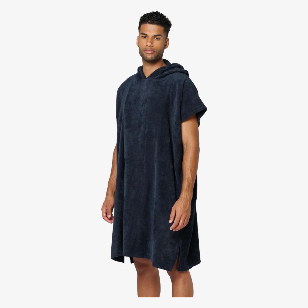 The unisex hooded terry poncho is made of absorbent terry fabric. It features a crossed hood at the front, a large central pocket open on the inside and two side openings at mid-height for easy dressing and undressing.