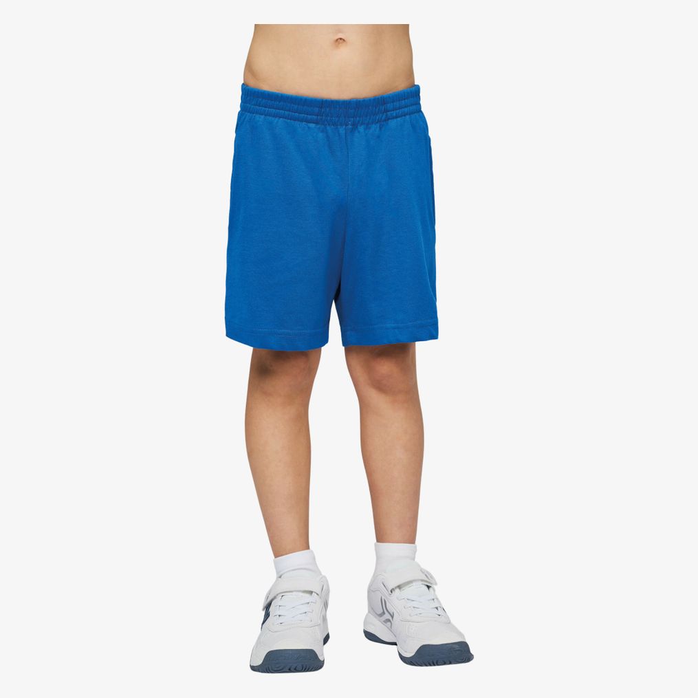The short jersey enfant is made from pre-shrunk ring-spun cotton. It has two side pockets and one patch pocket on the back. The waistband is elastic for adjustable fitting.
