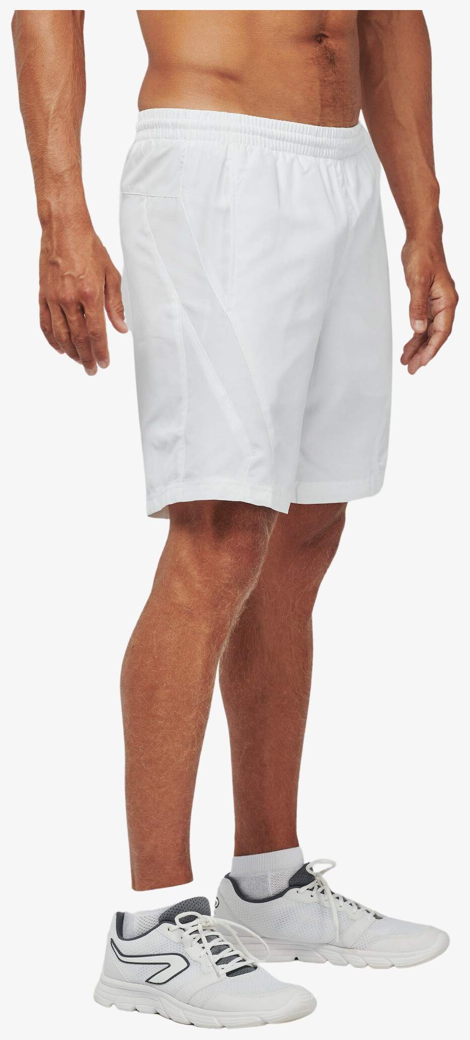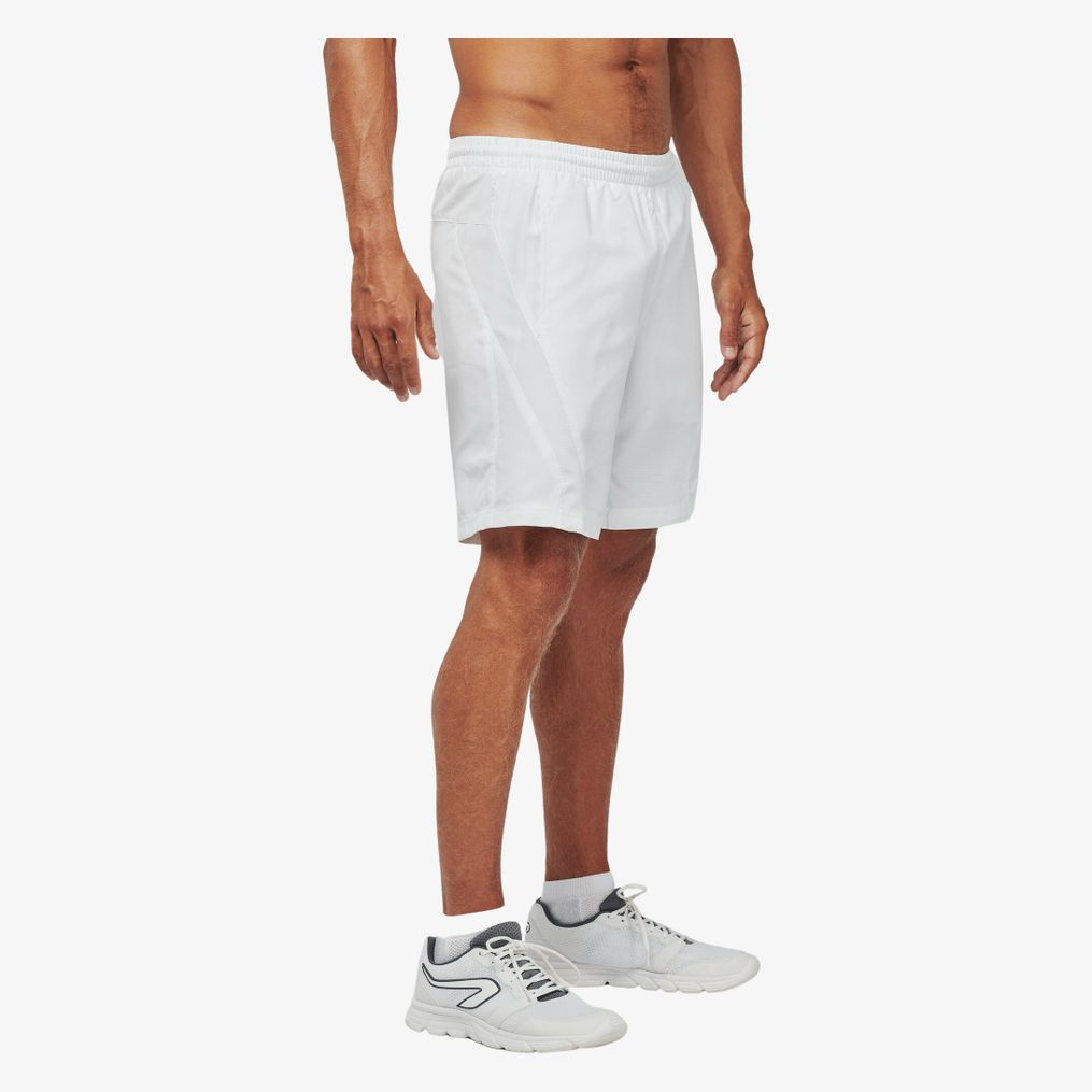 The short sport is made of quick-dry polyester with mesh lining. It has two side pockets and an elastic waistband equipped with a drawstring. The tone-on-tone side cut provides a uniform finish.