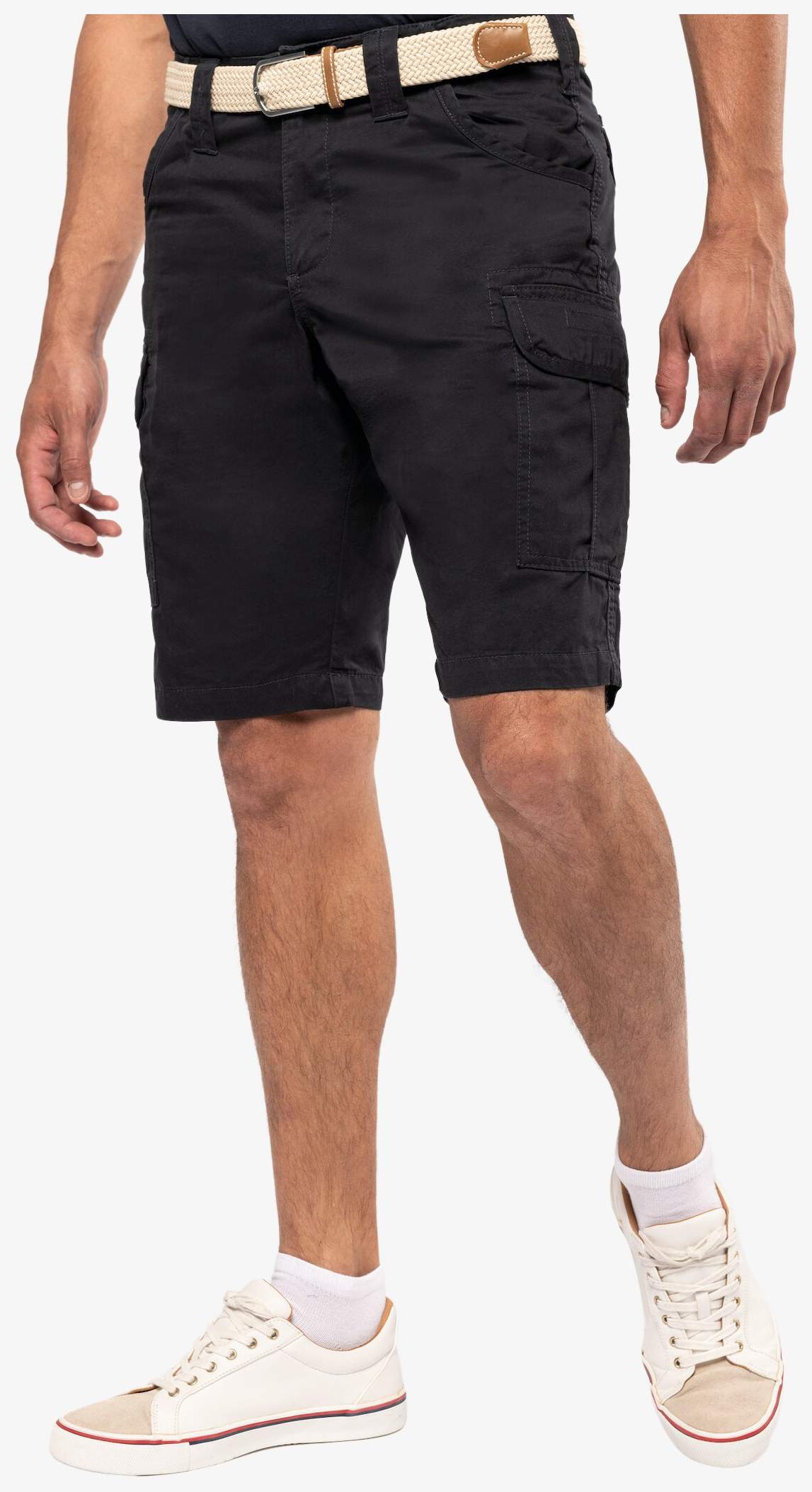 The bermuda multipoches is made of twill cotton with a zip closure and a button. It includes four side pockets, two of which are patch pockets with flap and snap button, as well as two back pockets with flap and snap button. The pockets are bordered for a neat finish.