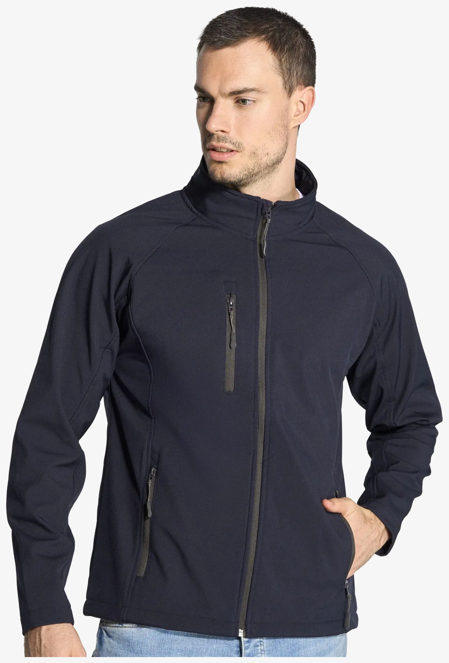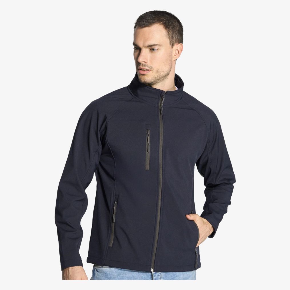 The Softshell jacket is a men's Softshell jacket made of three layers providing a structure suitable for varied uses. It includes two zipped side pockets and one zipped chest pocket. The fleece lining is equipped with stoppers for adjustment.