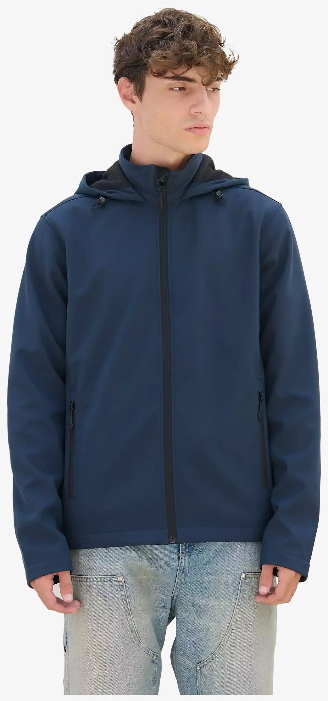 The men's hooded softshell jacket features a main opening and side pockets with black nylon zips. The hood is equipped with a drawstring. The back is slightly extended.
