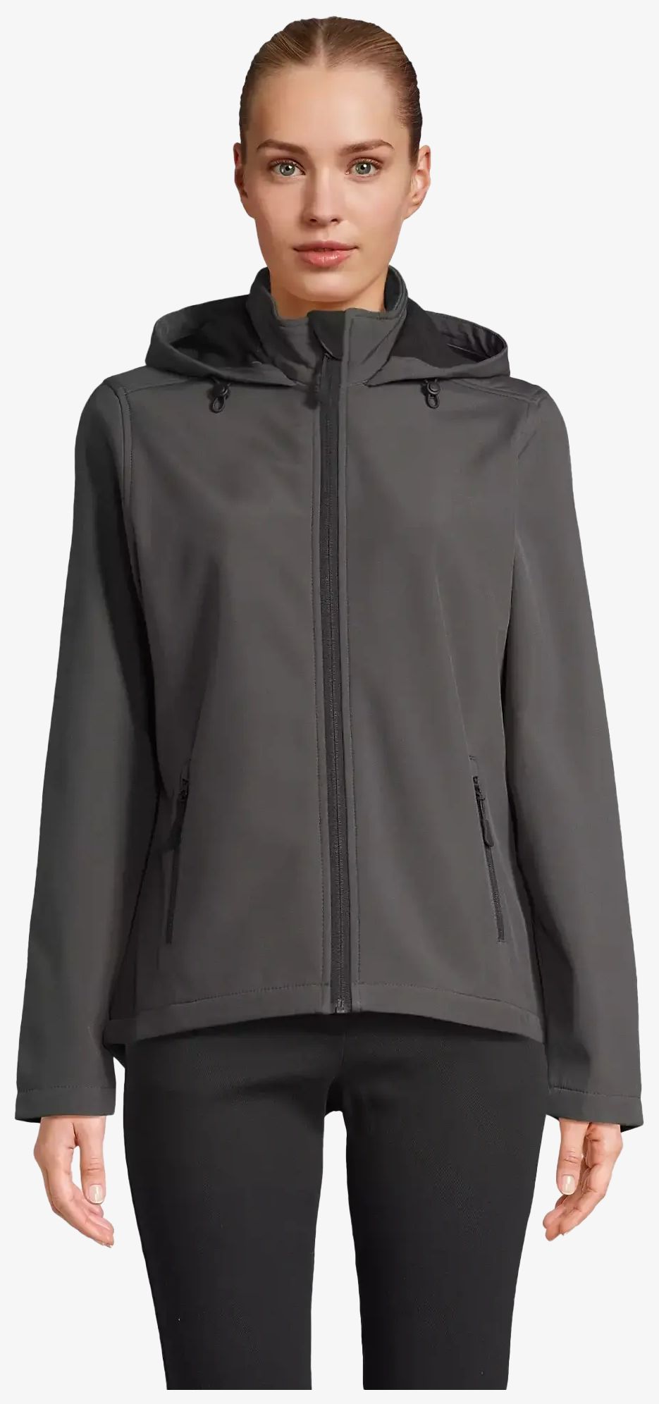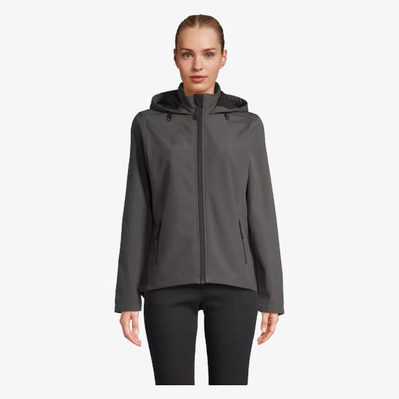 The women's softshell jacket with hood includes a main opening and zippered side pockets with black nylon zips. The hood is equipped with a drawstring and the back is slightly extended. The material consists of two layers, fleece interior and recycled polyester exterior.