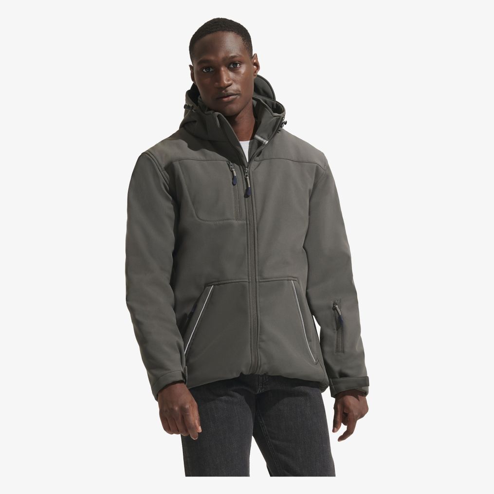 The Rock Men men's softshell 46604 is a quilted parka with a detachable, adjustable hood. Zip pockets and adjustments at the cuffs and hem make daily use easier. The 8000 mm membrane and 3-layer construction help limit moisture ingress and promote ventilation.