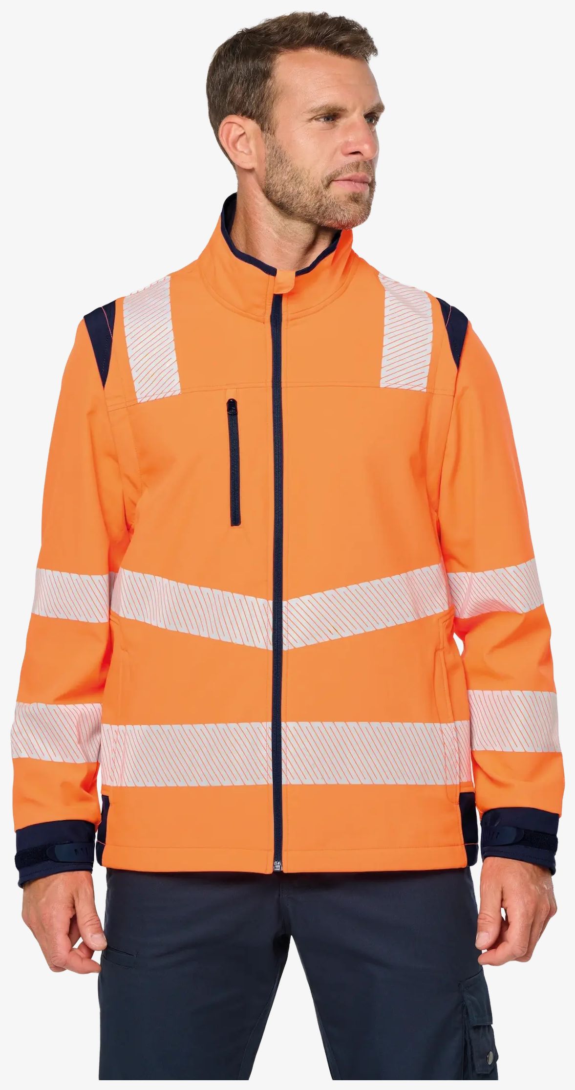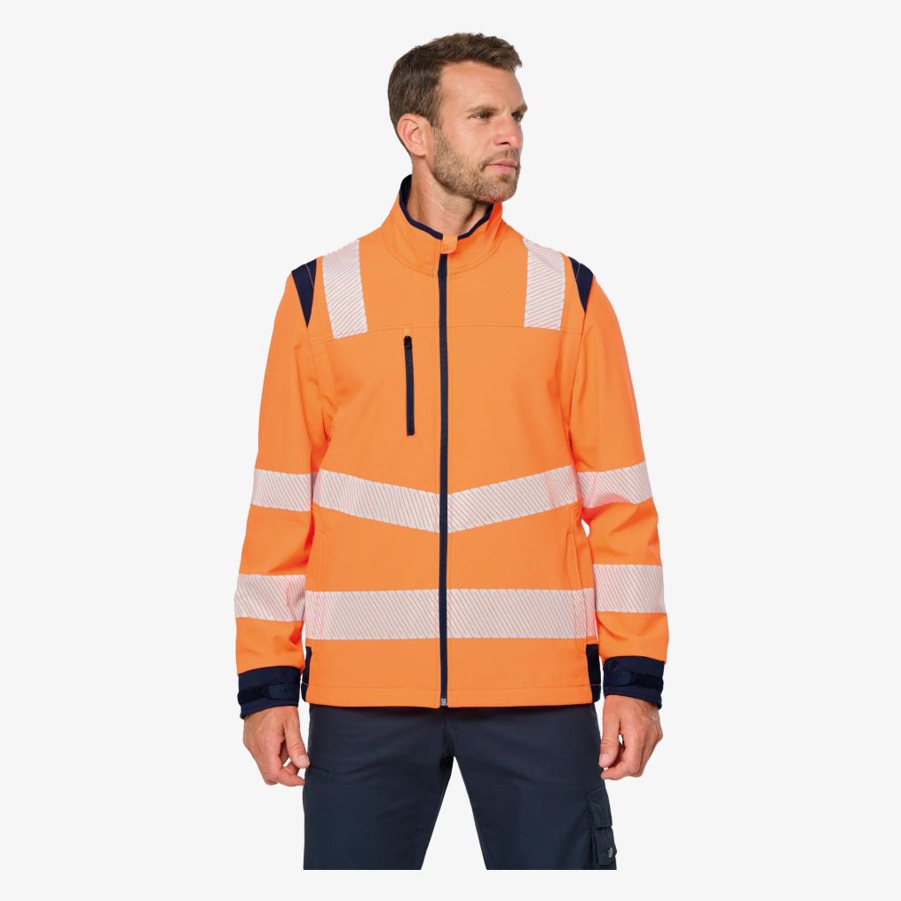 The unisex recycled softshell jacket with detachable sleeves combines modularity and comfort thanks to its removable sleeves and three-layer fabric. It features multiple zippered pockets and retro-reflective strips for visibility.