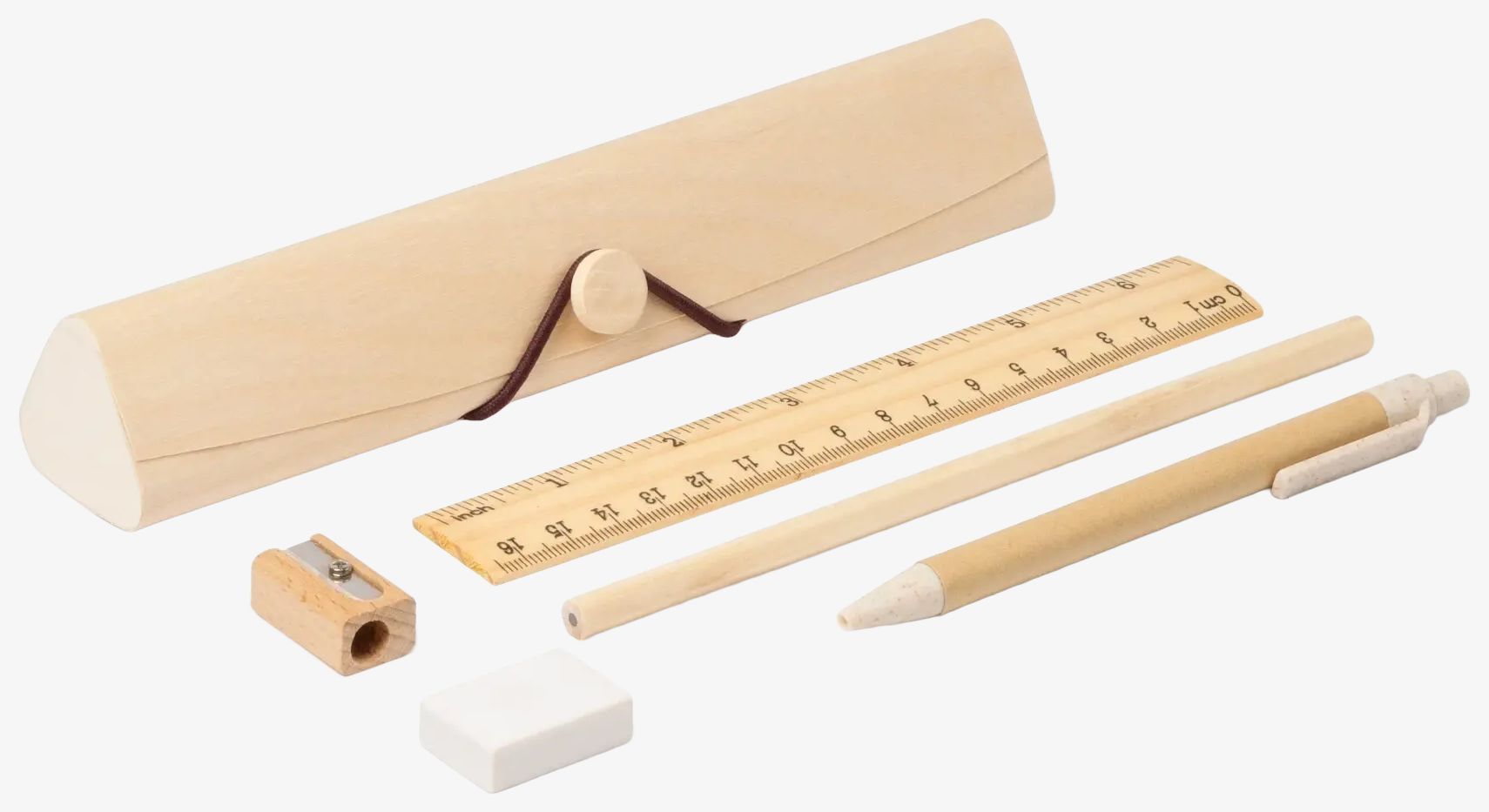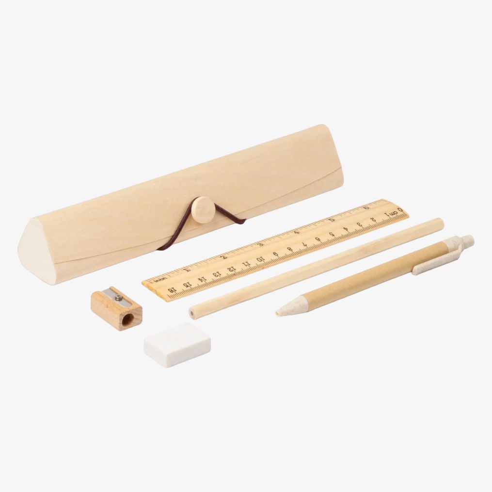 The natural wood writing set includes a ruler, pencil, recycled cardboard pen with push button, eraser, and sharpener, presented in a wooden box. Dimensions: 20 x 4.4 x 3.7 cm.