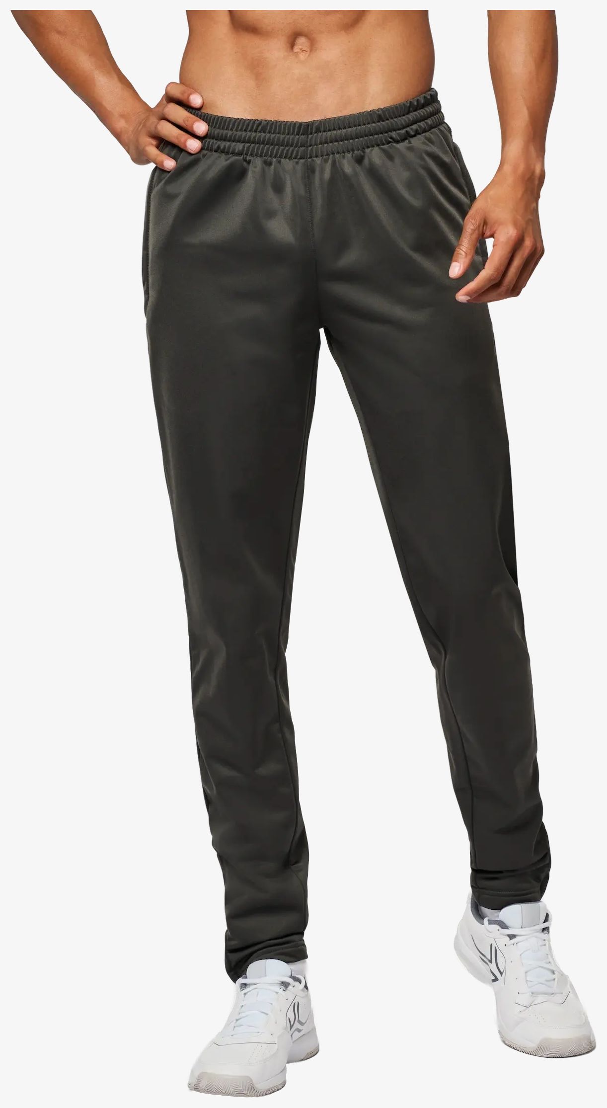 The unisex tracksuit pants are made of polyester with a mesh back panel for ventilation. They feature two side zipped pockets, an elastic waistband with drawstring and zipped leg bottoms. The fit is slim and modern.