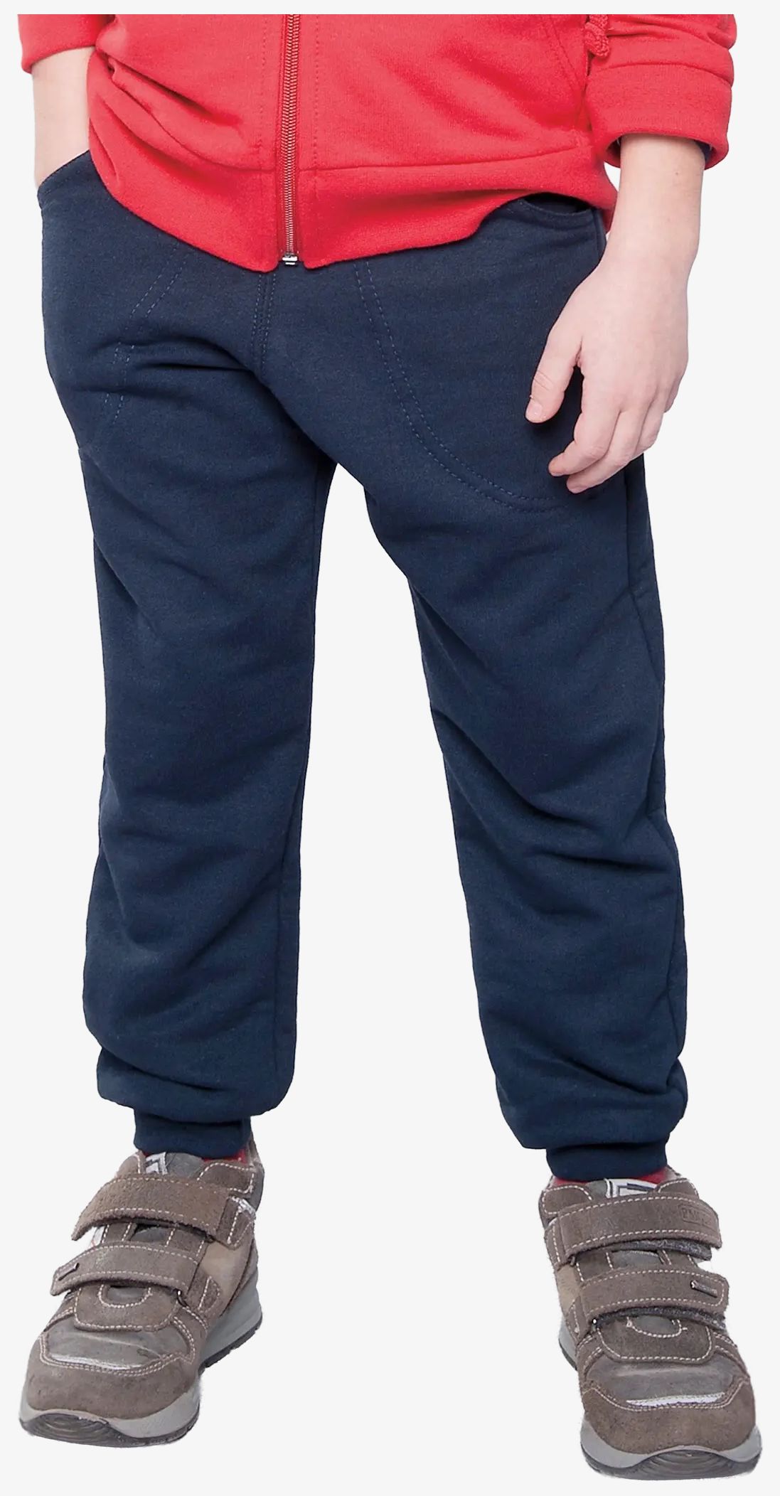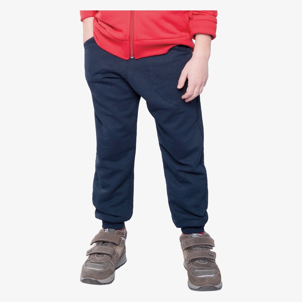 The children's jogging pants include two front pockets, a brushed interior and an elastic waistband. The composition is 70% cotton and 30% polyester.