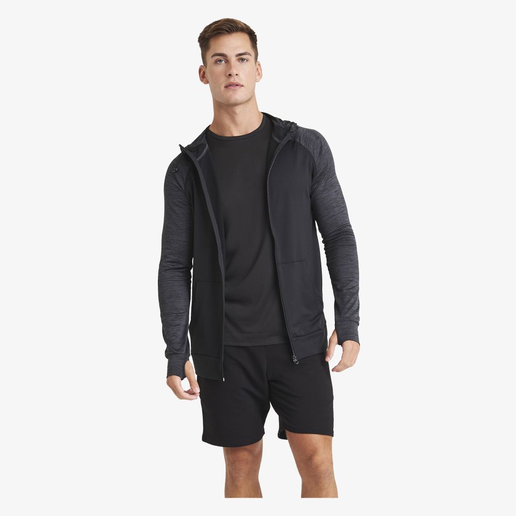 The zipped hoodie combines moisture-wicking fabric with a slightly brushed body. The adjustable drawstring hood protects against the elements, raglan sleeves and thumb loops offer great freedom of movement.