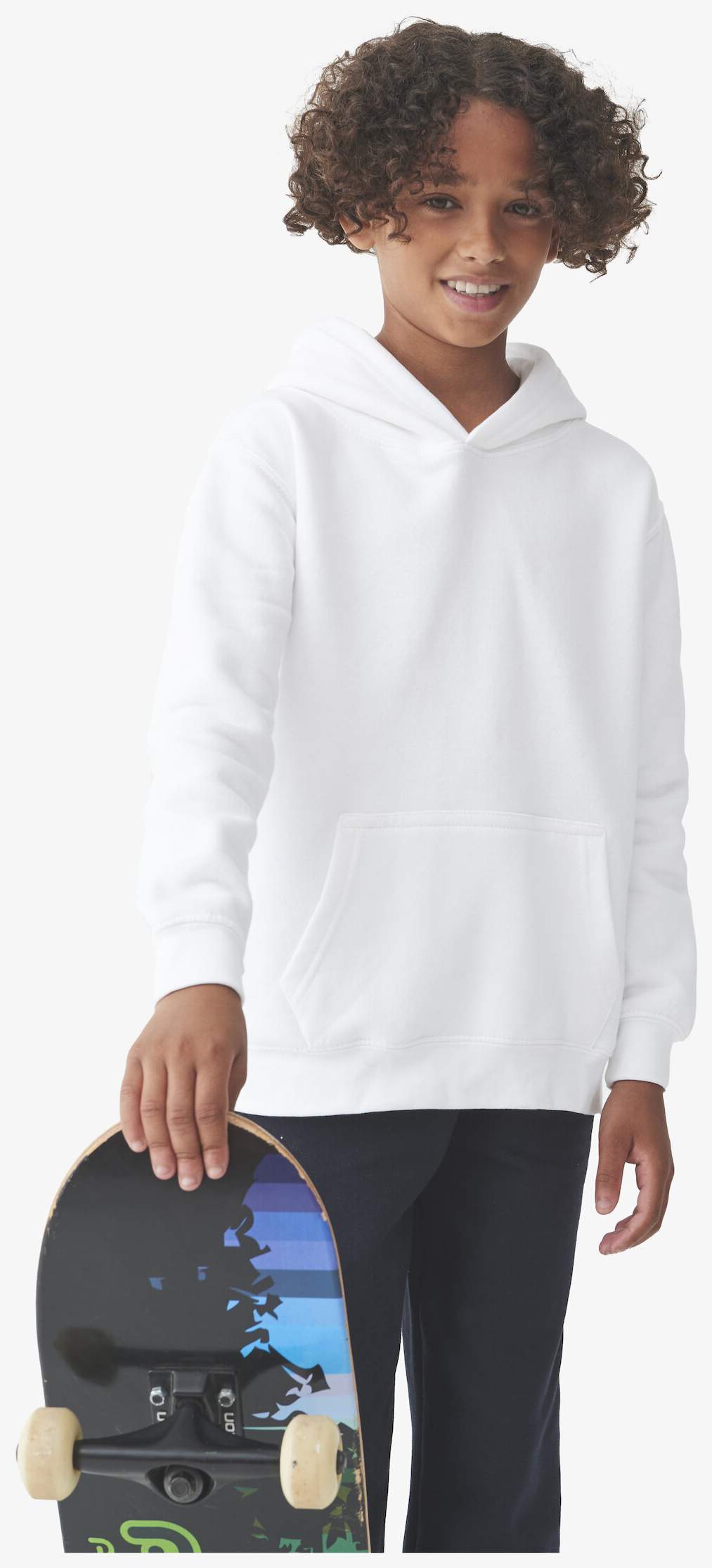 The children's hoodie combines organic cotton and recycled polyester with a brushed fleece interior providing a soft and smooth surface. The hood is lined and cord-free, compliant with European legislation. The model includes kangaroo pockets, ribbed cuffs, and a double-stitched hem.