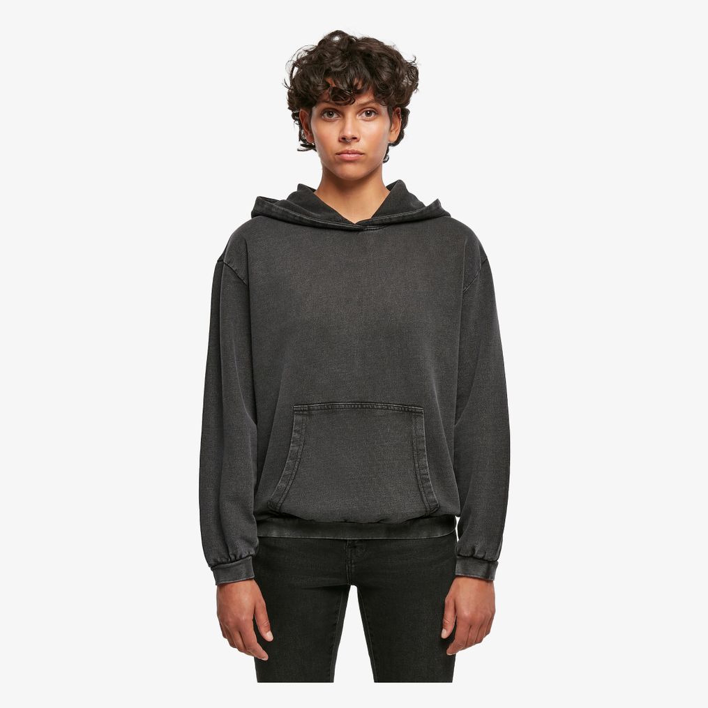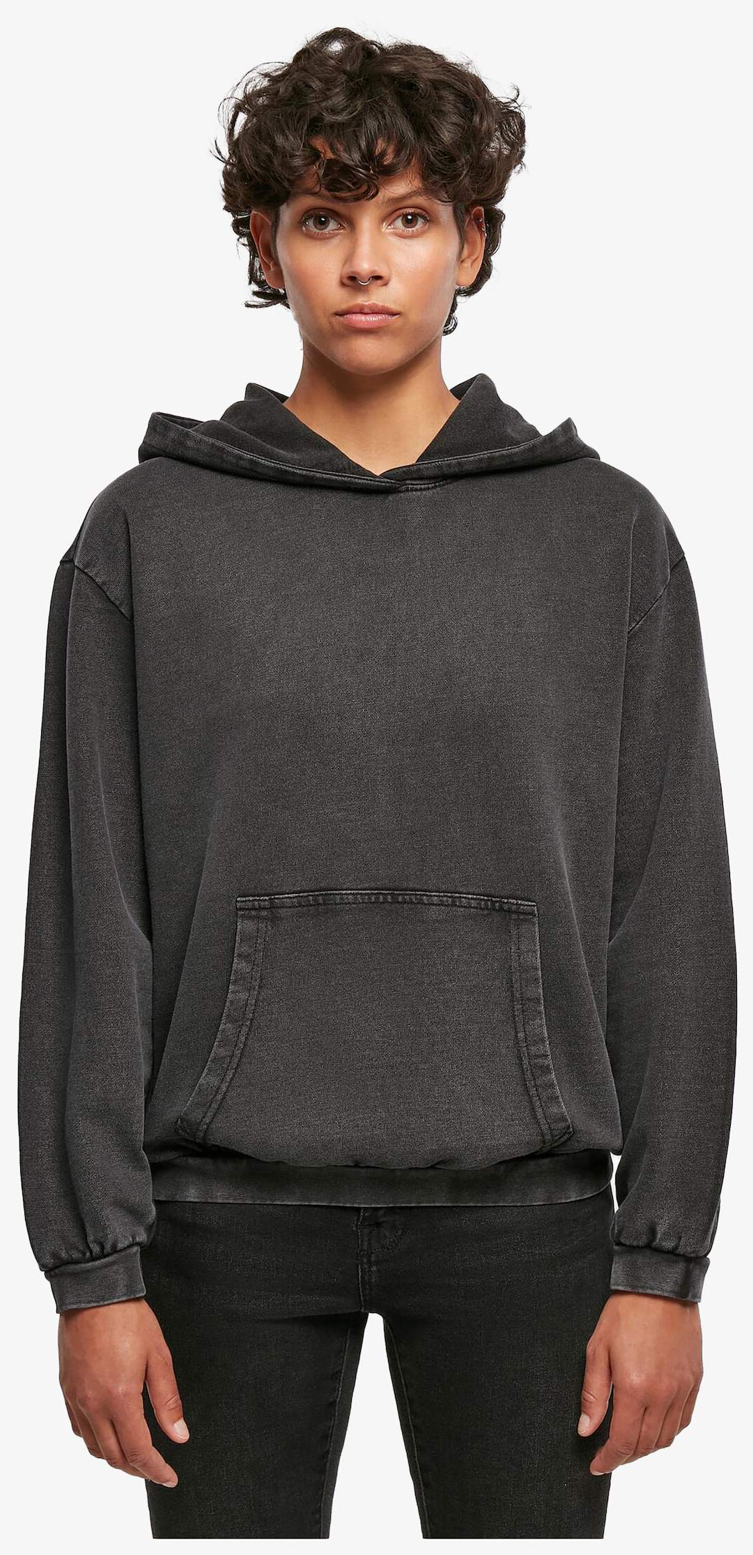 The oversized hoodie for women features a relaxed fit with a washed effect. It includes a hood and kangaroo pocket for added functionality. 1x1 ribbing is used for some model details.