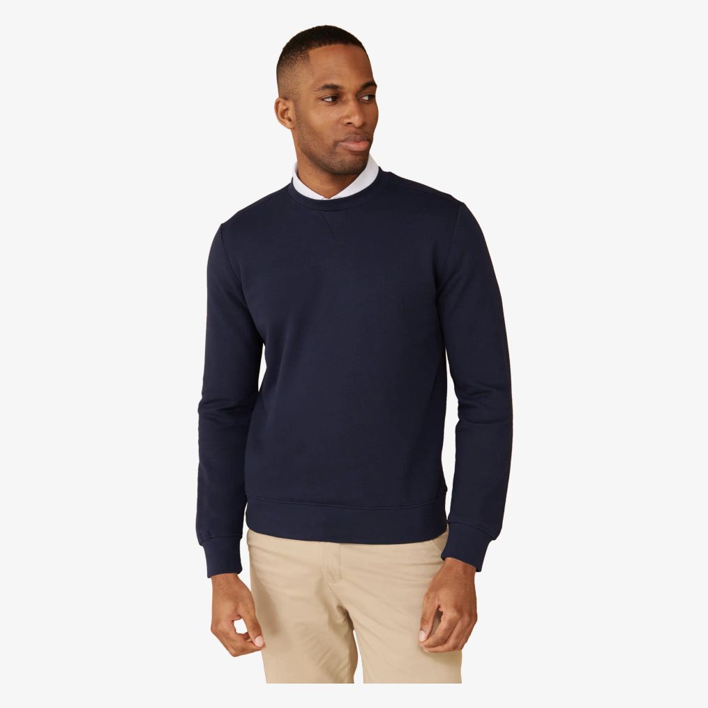 Regenerated cotton sweatshirt combines regenerated cotton and recycled polyester with a brushed interior for a specific texture. It features ribbed cuffs and straight sleeves.