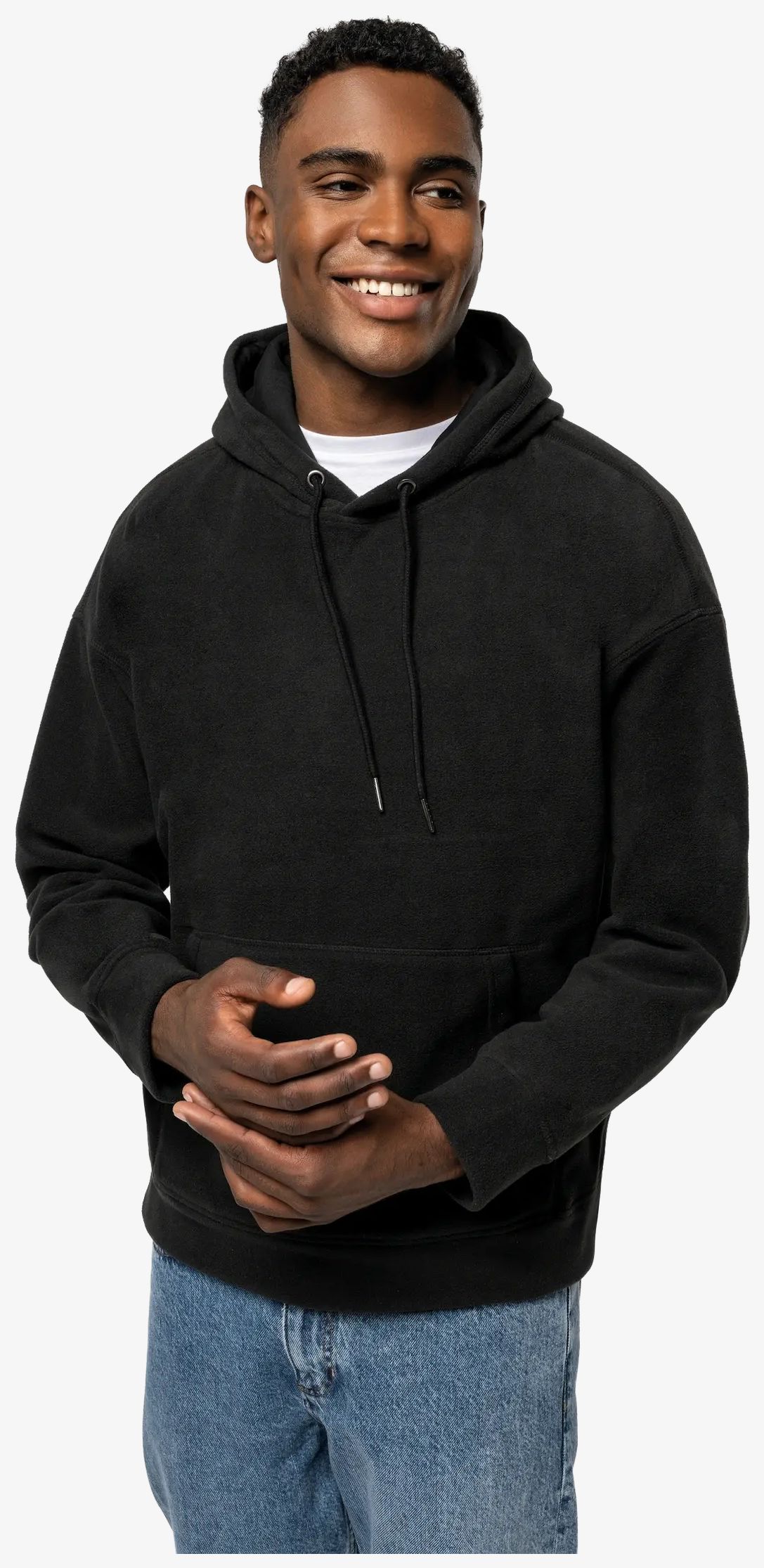The oversized hooded sweatshirt in recycled micropolar fleece is made of post-consumer recycled polyester. It features an oversized fit with cotton-lined hood and kangaroo pockets.