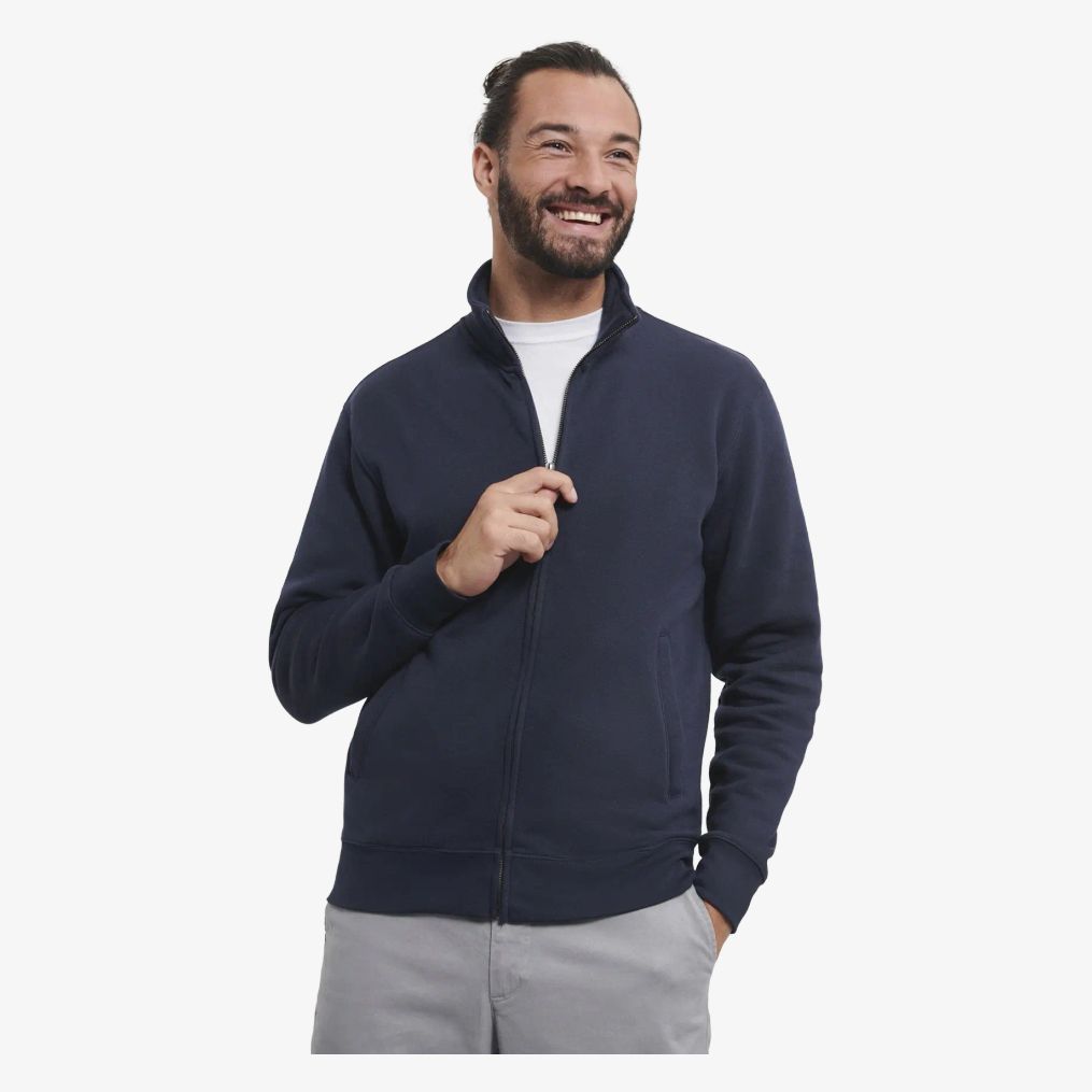 The men\u0027s zipped sweatshirt features a straight and contemporary cut with cadet collar and chevron tape. It includes pockets in the same fabric and headphone access. The metal zipper is protected by a flap. The seams on shoulders and armholes are visible and covered.