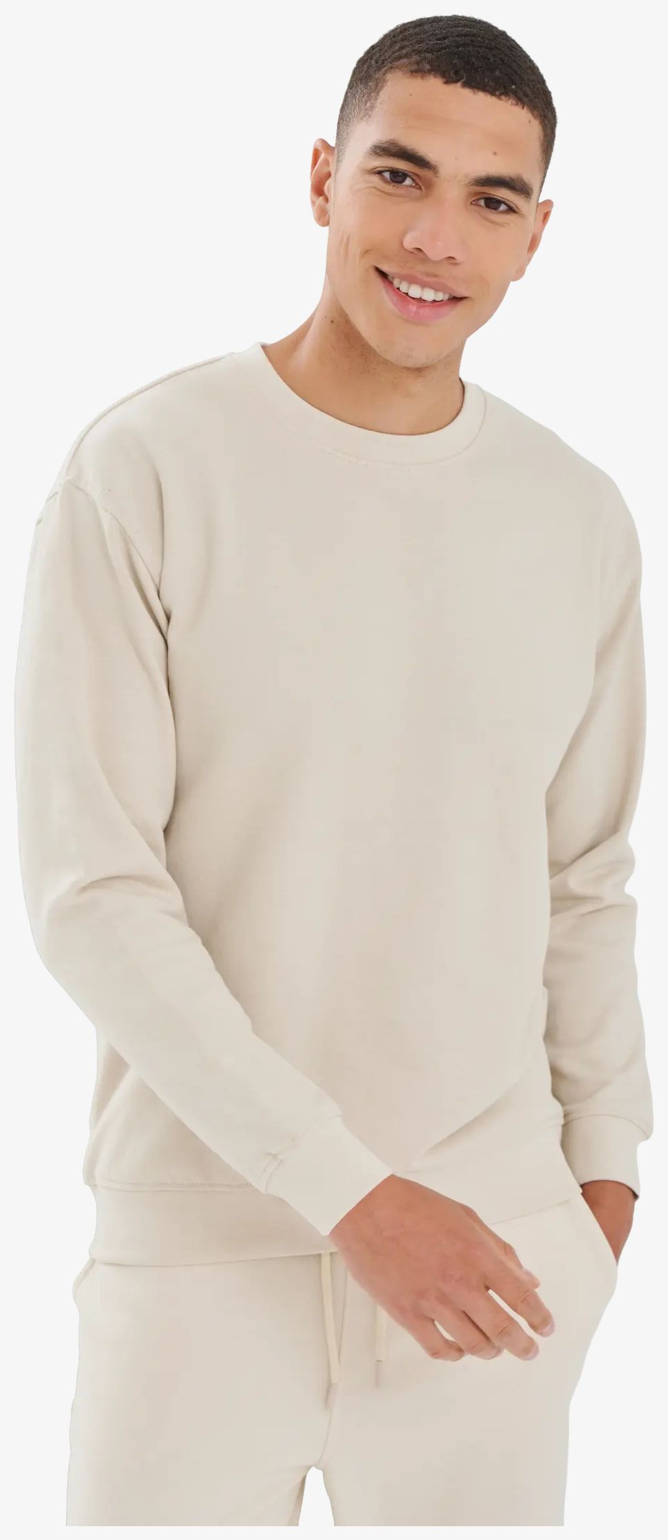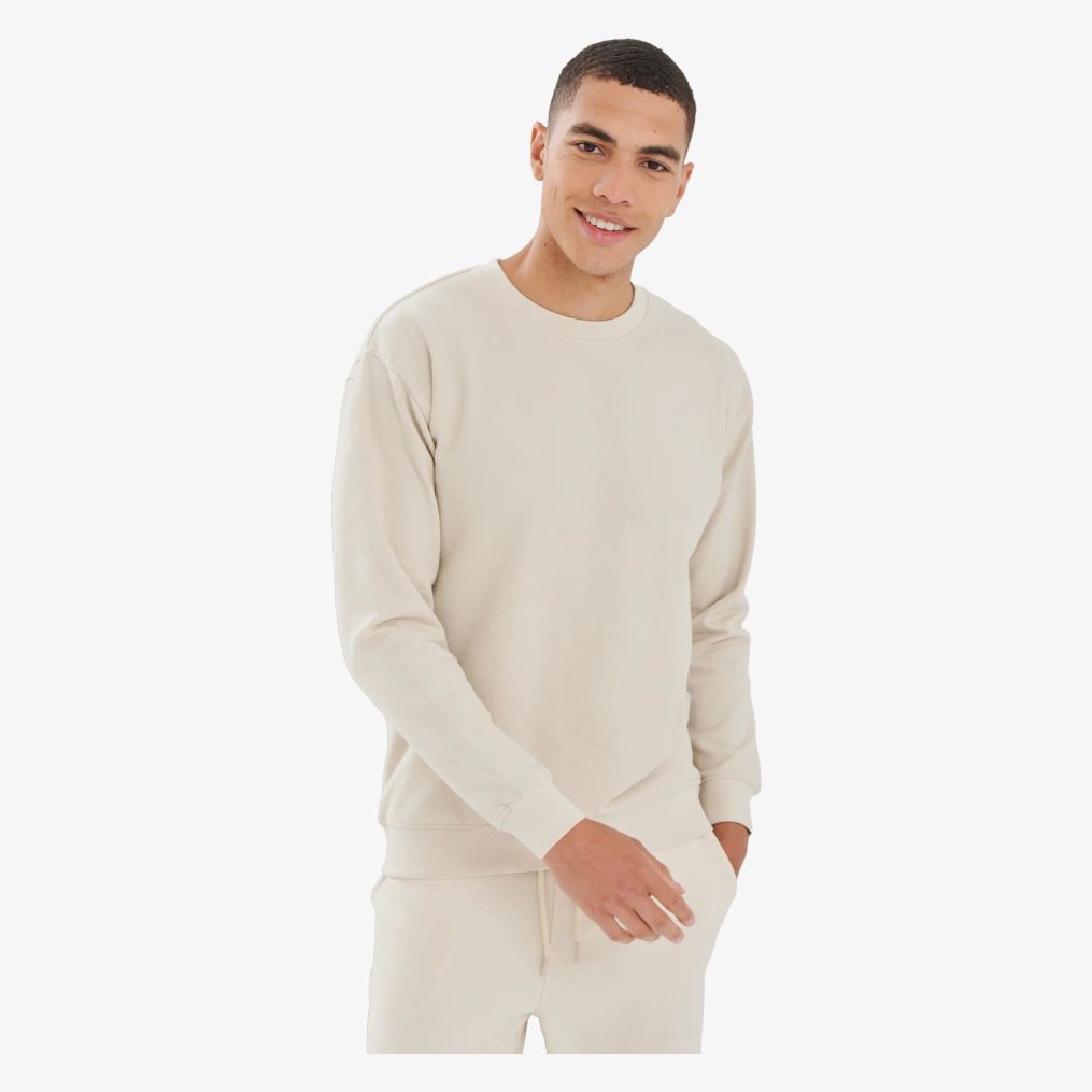 The sweatshirt made of regenerated cotton and recycled polyester combines straight sleeves, dropped shoulders, a round neck, and a brushed interior. The cut is longer at the back with ribbed cuffs and tone-on-tone stitching. The neck tape is made of single jersey.