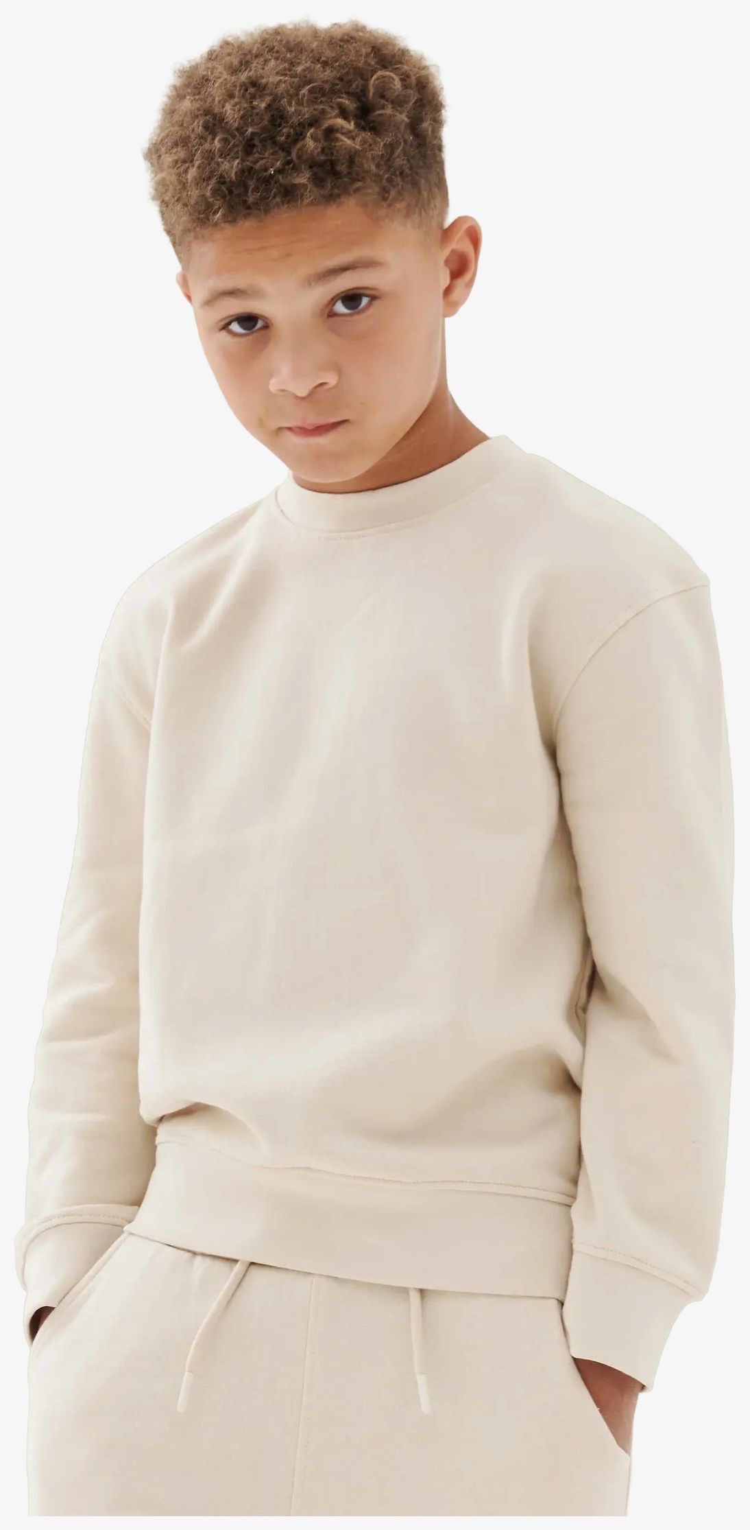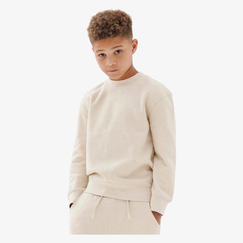 The casual child sweatshirt includes set-in sleeves and dropped shoulders. The back hem is longer, front rounded high and lower back. The cuffs are ribbed and the neckline is round. Neck back facing tape in single jersey. Tone-on-tone topstitching. Brandless label.