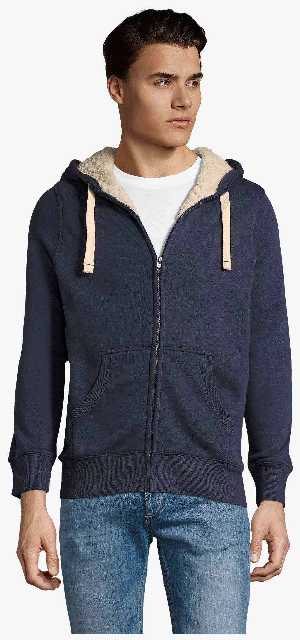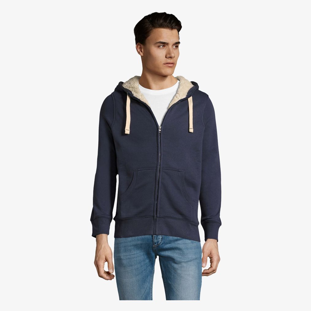 The Sherpa is a full-zip hooded sweatshirt with sherpa lining on the body and hood. Its fitted cut, kangaroo pocket and ribbed trims provide stable wear for everyday use.