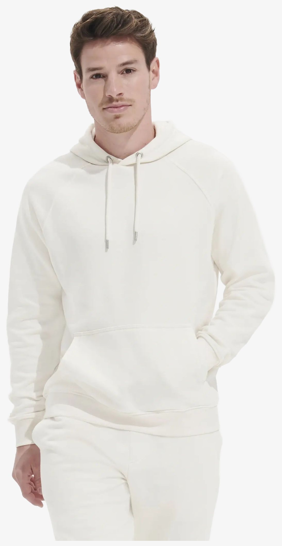 The unisex Stellar hoodie is a cut and sewn model with raglan sleeves and jersey-lined hood. It includes a drawstring with metal eyelets, 2x2 ribbed cuffs and an internal half-moon at the collar. The composition combines 80% organic cotton and 20% recycled polyester.