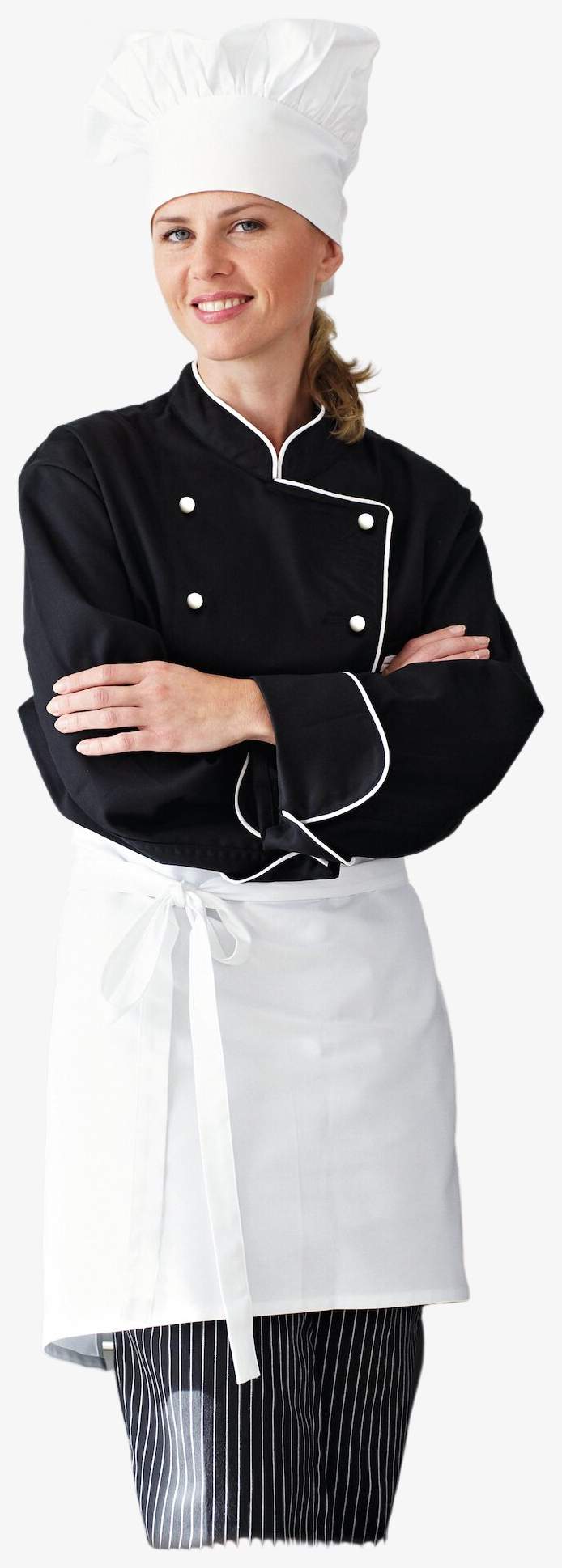 The tablier 90 x 60 cm is made of 65% polyester and 35% cotton with a support strap. Black color supports industrial washing at 75°C, other colors at 60°C.