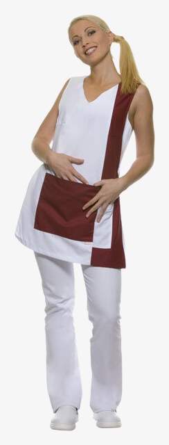 The apron Worksmock Marilies is made from fabric combining 65% polyester and 35% cotton. It includes chest darts, two patch pockets on the front and tie ribbons for adjustment. The back length is approximately 83 cm. The fabric is designed to withstand industrial washing and remains stable after washing.