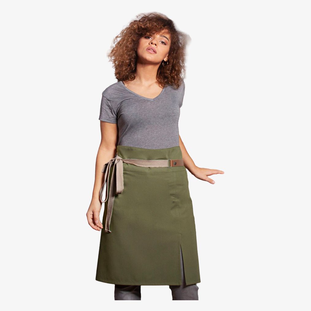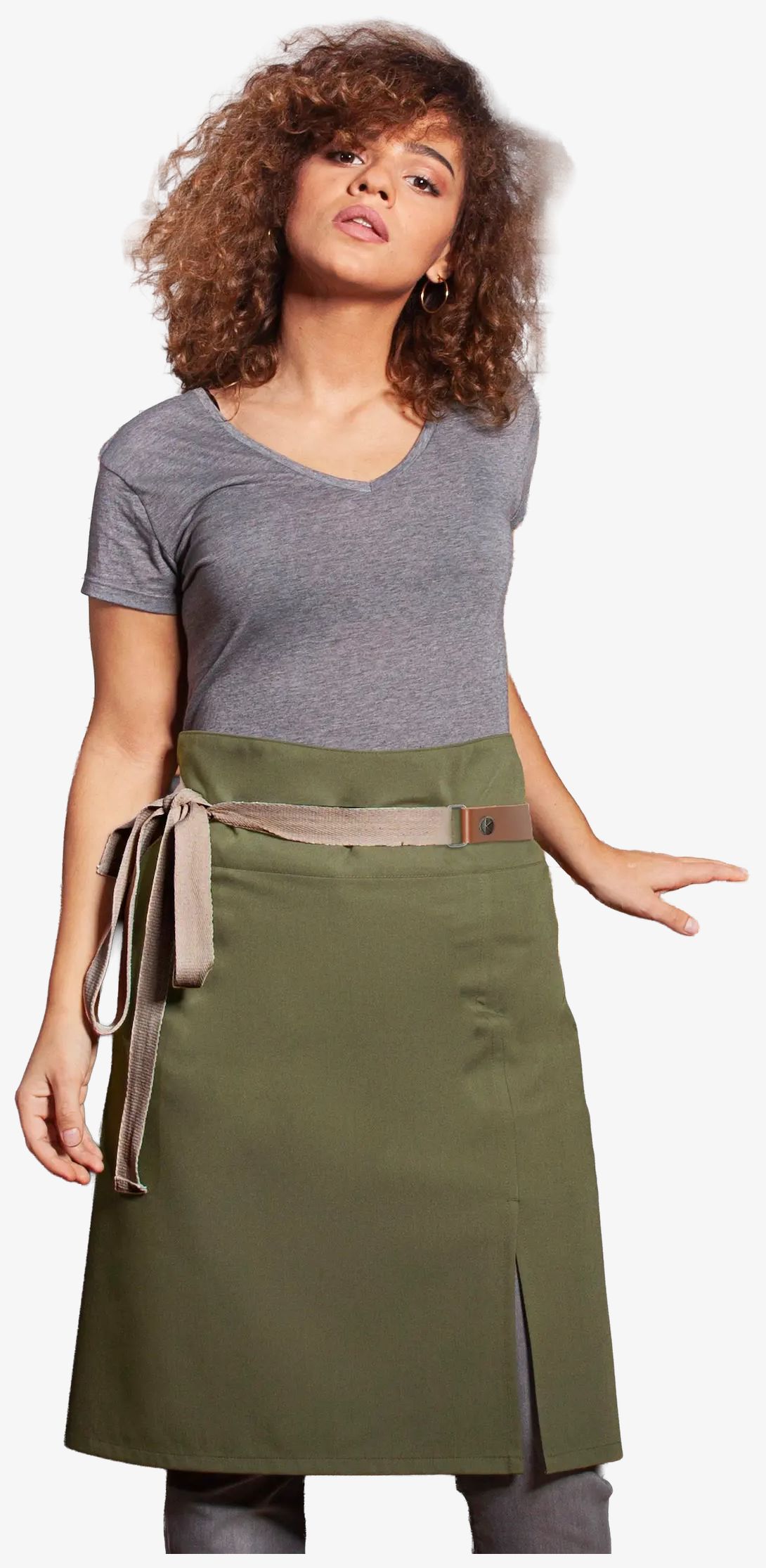 The mid-length apron is made of recycled polyester and cotton with leather and contrasting fabric straps. It has two patch pockets on the sides for practical storage.