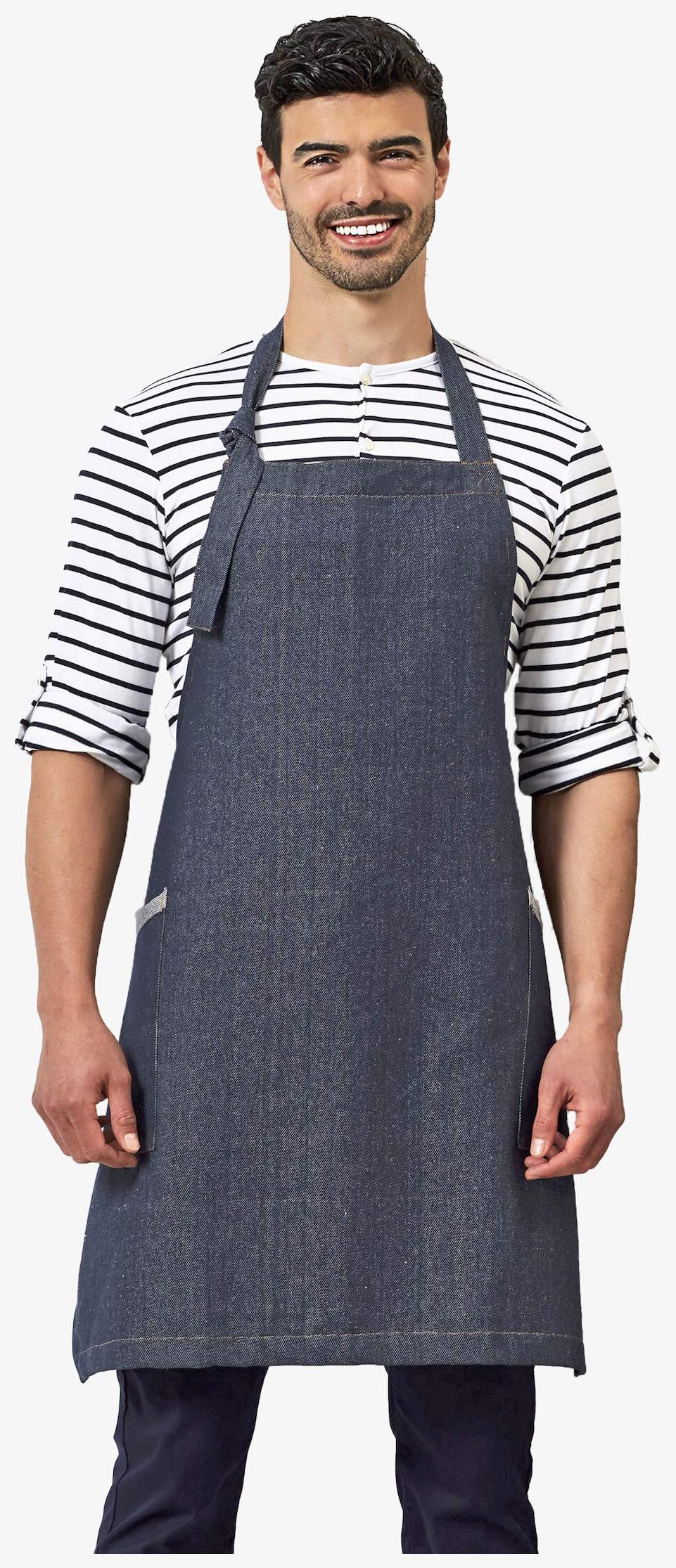 The bib apron pr122 is made of handwoven regenerated denim in a low carbon footprint factory. It features two bias side pockets with contrasting edging and an adjustable neck strap by knotting. Its texture is soft, resembling linen.