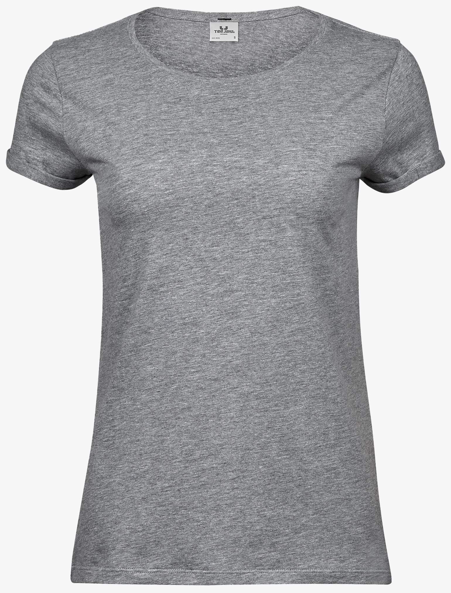 The rolled sleeve tee-shirt for women features a relaxed fit and a wide neckline. It has a shoulder-to-shoulder clean finish band and attachable rolled sleeves. The fabric is pre-shrunk.