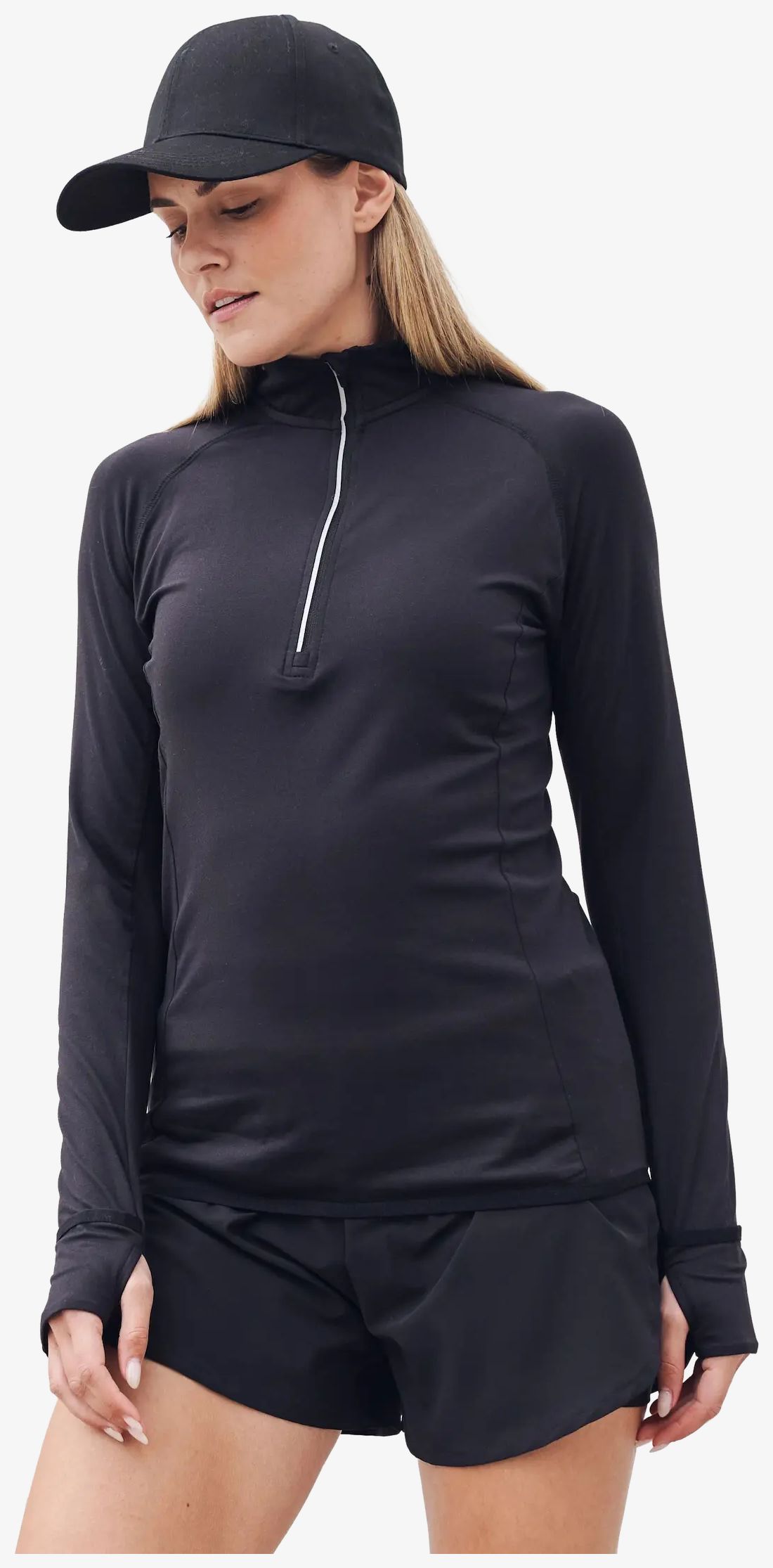 The Ladies' long sleeved 1/4 zip top is a long sleeved tee-shirt designed for sports use. It features a reflective 1/4 zip collar, raglan sleeves and a key pocket on the back. A detachable label and headphone access complete its functions.