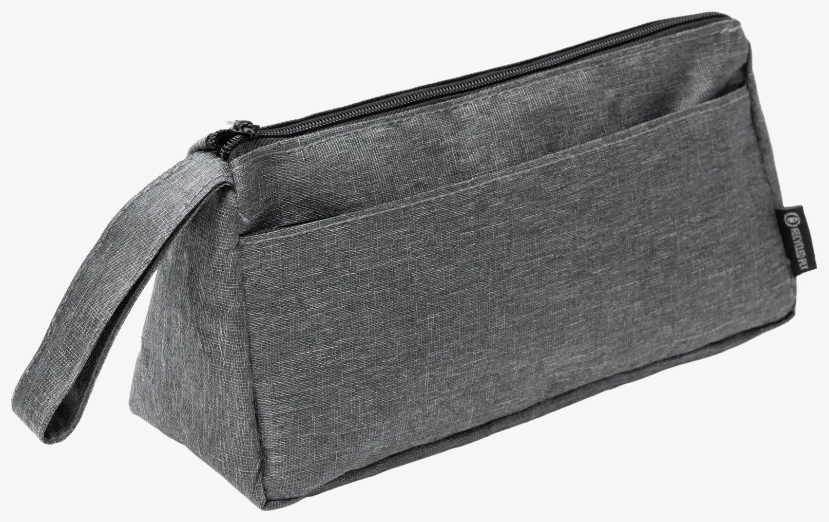 The YULIA toiletry bag is made of RPET 300 D. It includes a main compartment and an outer pocket with zipper closure. A handle facilitates transport.