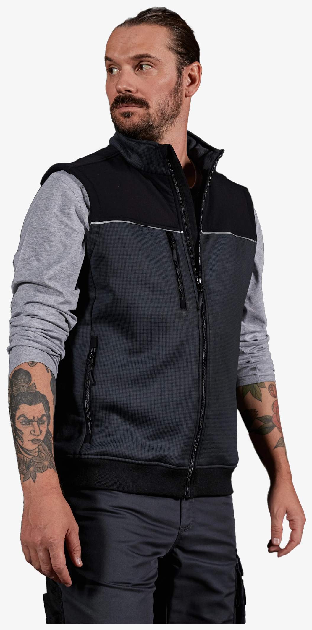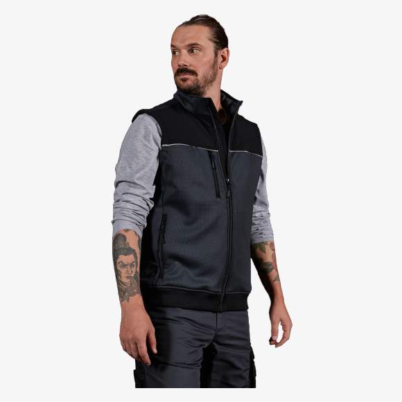 El Hybrid Workwear Vest es un bodywarmer softshell con interior de Sherpa. Presenta paneles lisos en el frente y la espalda. Es resistente al agua y a la suciedad gracias a un acabado específico. La cremallera invisible se extiende a lo largo de todo el cuerpo. El cuello alto protege el mentón. El dobladillo tiene un ribete elástico. Cuenta con bolsillos laterales, un bolsillo en el pecho con cremallera y dos bolsillos interiores. Elementos reflectantes están ubicados en el frente y la espalda.