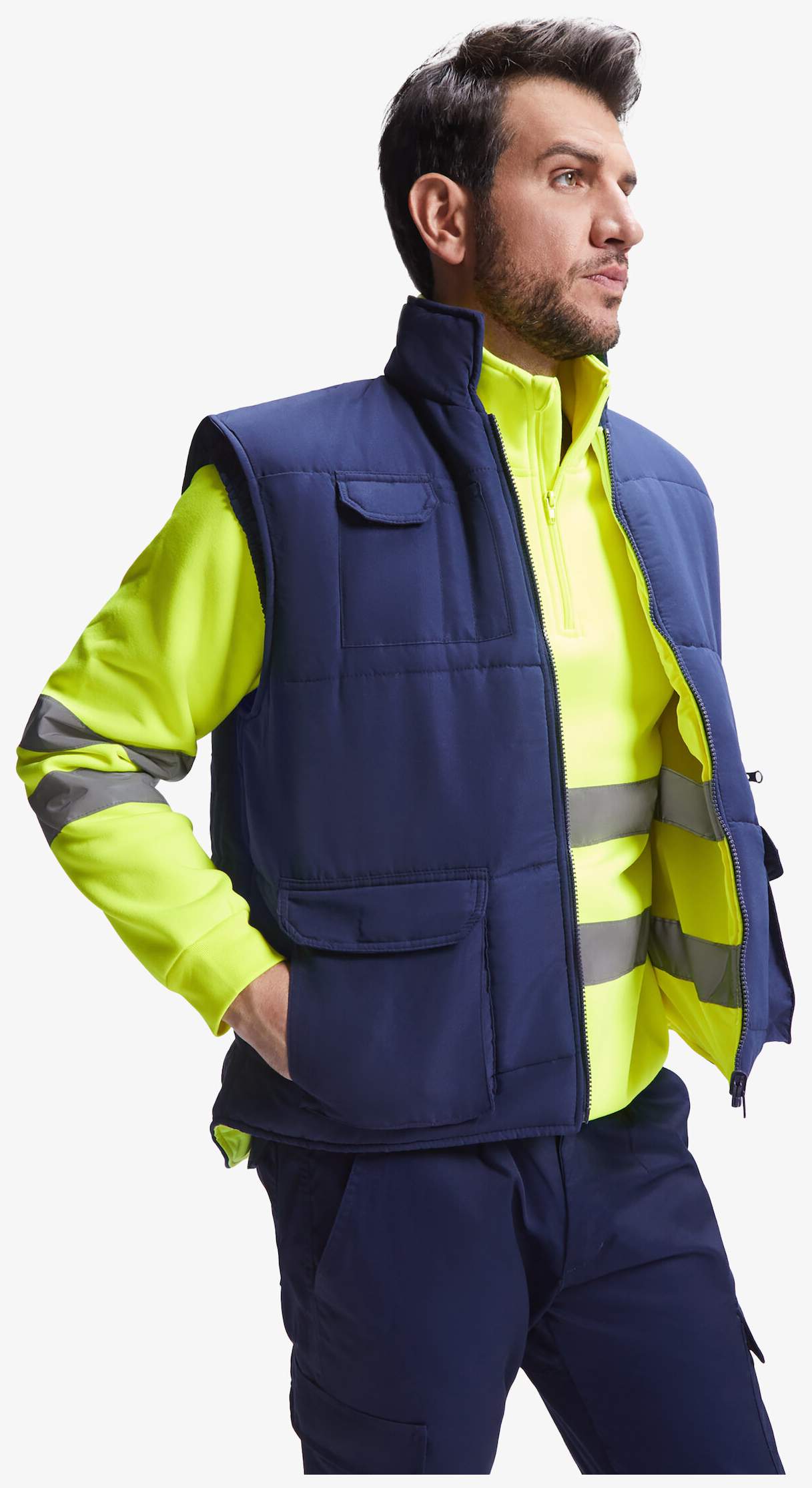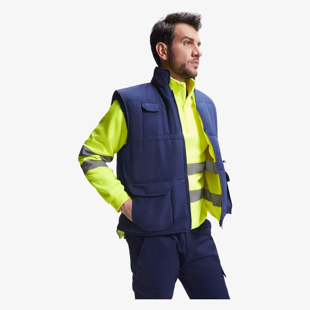 La chaqueta chaleco de seguridad Persei es reversible con cuello alto y varios bolsillos funcionales. Dispone de una cremallera central reversible, un bolsillo exterior para teléfono móvil a la derecha, dos bolsillos delanteros con fuelles y aperturas laterales, dos bolsillos para bolígrafos y un bolsillo con cremallera. El modelo incorpora un cortaviento en los puños, un dobladillo trasero más largo y un ajustador elástico para el ajuste. Dos bandas reflectantes horizontales aseguran una mejor visibilidad.
