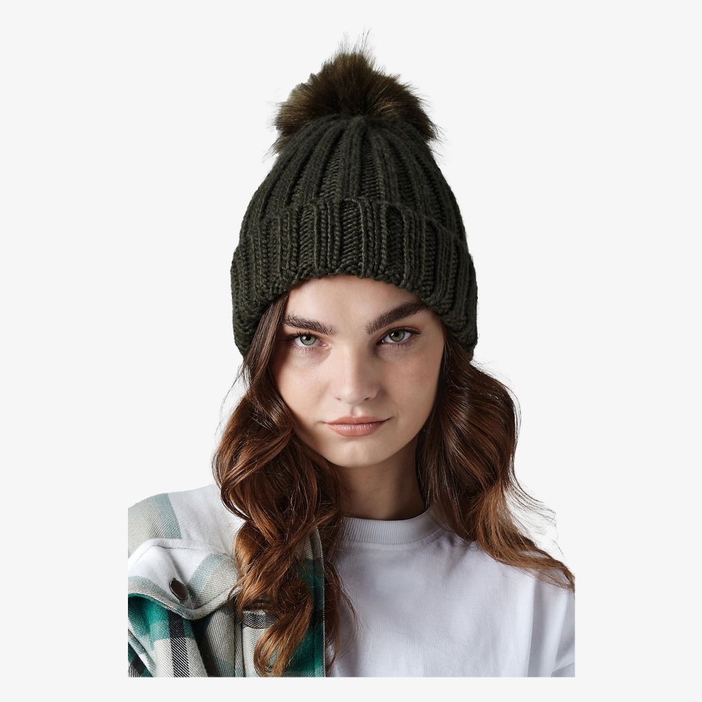 B413 - Bonnet à pompon en maille épaisse et fourrure Verbier Beechfield