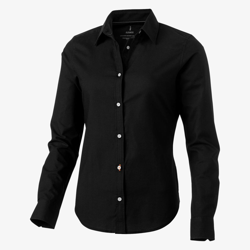 La camisa de manga larga para mujer incluye puños ajustables con pliegue simple, botones de perla grabados, costuras formadas en la cintura con elástico para un ajuste. El ribete satinado está presente dentro del cuello y la etiqueta principal es en transferencia para mayor comodidad. La tela es Oxford 100% algodón.