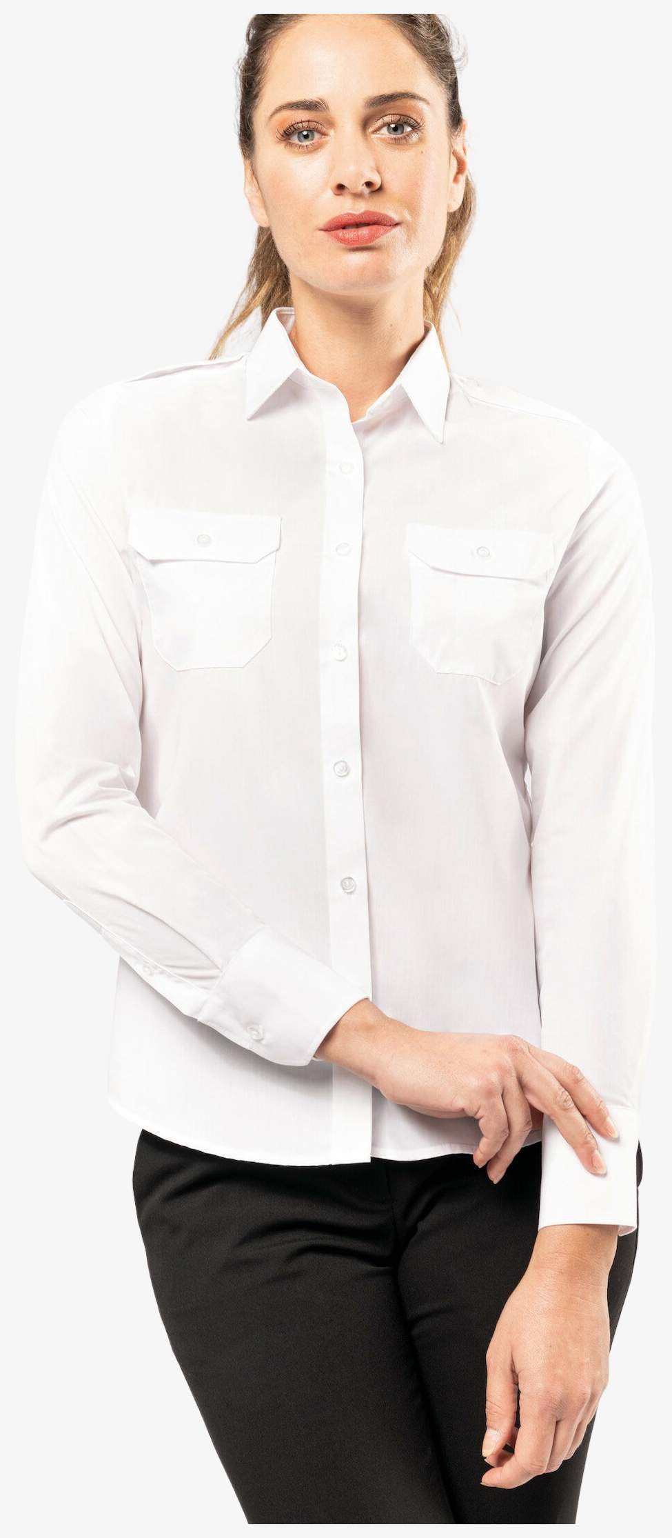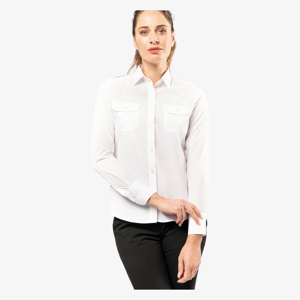 La chemise pilote manches longues femme combina un tejido popelina de 65% poliéster y 35% algodón. Incluye botones tono sobre tono, 2 bolsillos en el pecho con solapa, uno con soporte para bolígrafo al lado del corazón y trabilla abotonada en los hombros.