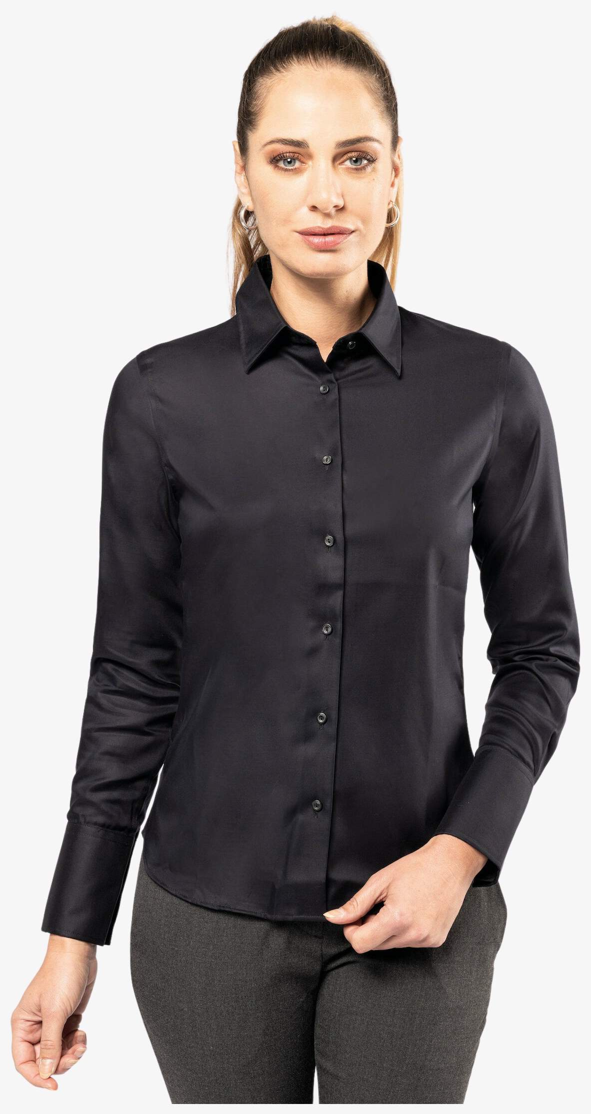 La Chemise manches longues sans repassage femme k538 de algodón micro sarga, tejido sin planchado, adecuada para un uso profesional o diario. Cuello sin botones, botones tono sobre tono, puños de 3 botones con tapeta capuchina, bajo redondeado.