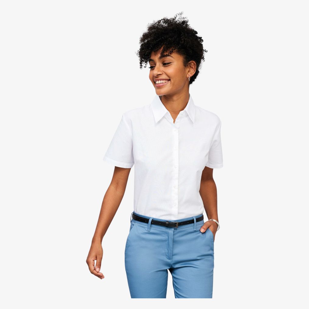 La camisa Elite de manga corta es adecuada para uso profesional o diario. Cuello clásico, cierre de 2 botones y pinzas en el pecho. Tejido 70% algodón 30% poliéster, hilo teñido.