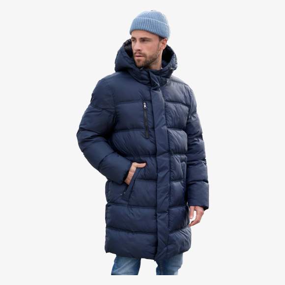 El abrigo de invierno acolchado de poliéster reciclado cuenta con un relleno Sugenro dividido en grandes compartimentos, capucha ajustable y cierre de cremallera bidireccional de largo completo. Incorpora un bolsillo en el pecho y dos bolsillos laterales con cierre de cremallera, así como dos grandes bolsillos internos. Puños elásticos internos y costura triple completan sus características.
