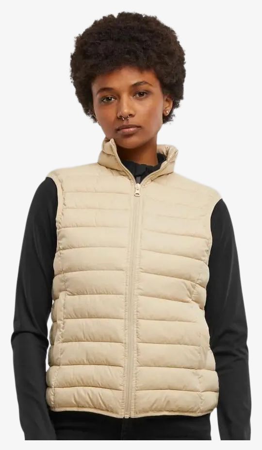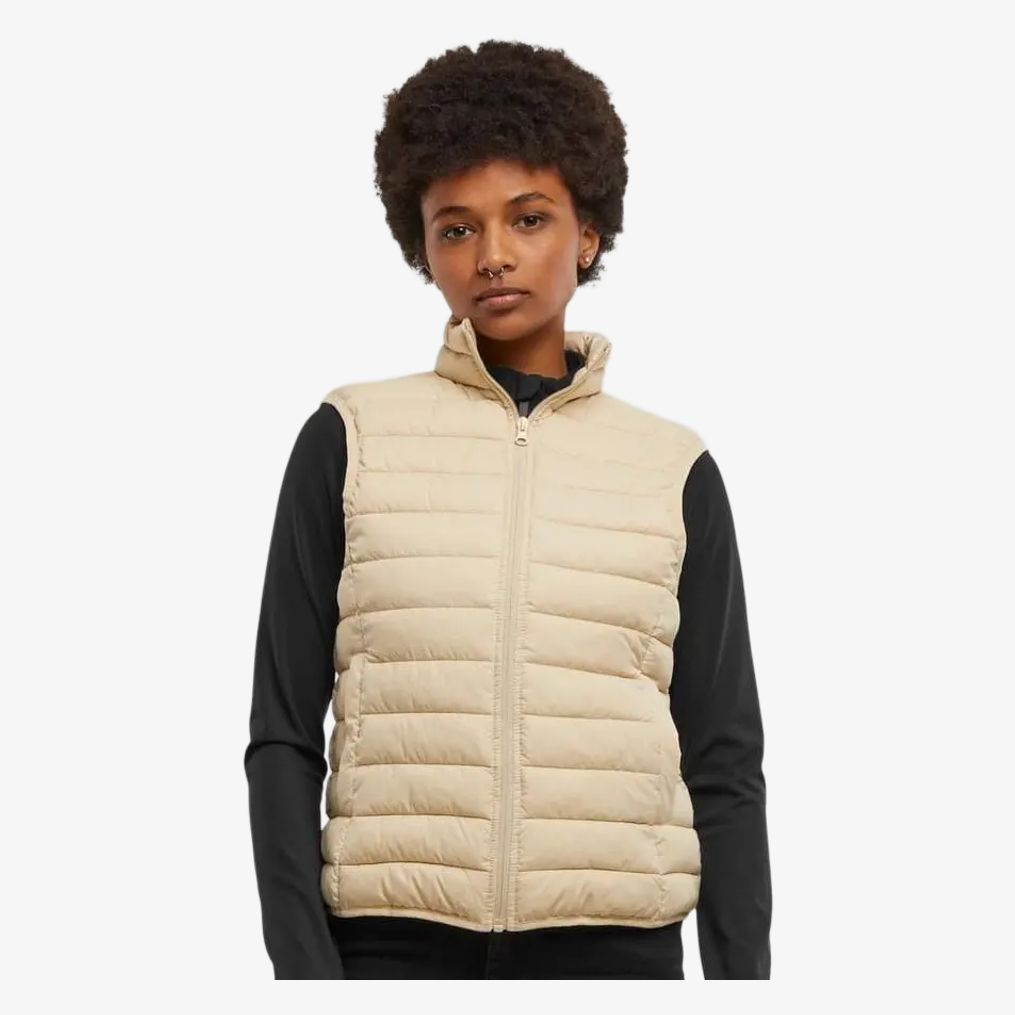 El chaleco acolchado ligero para mujer tiene un corte ajustado y un cuello alto que limita el paso del viento sin añadir volumen. Puede llevarse sobre un tee-shirt de manga larga o un suéter. Las sisas son elásticas para mayor comodidad y cuenta con dos bolsillos laterales integrados.