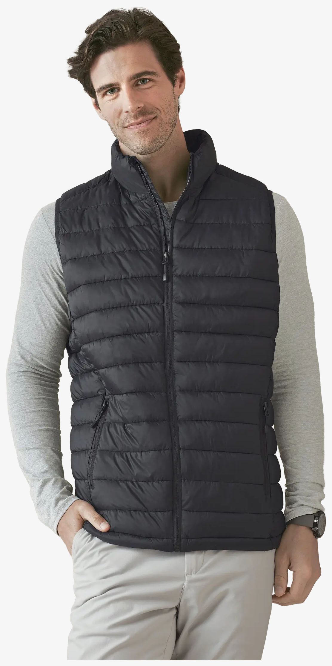 El chaleco acolchado para hombre combina aislamiento térmico y bajo peso. Se guarda en su bolsillo interior para ahorrar espacio durante actividades al aire libre. El cuello alto y la media luna en la parte trasera aportan una forma estructurada. Cremalleras SBS y varios bolsillos garantizan una funcionalidad adecuada.