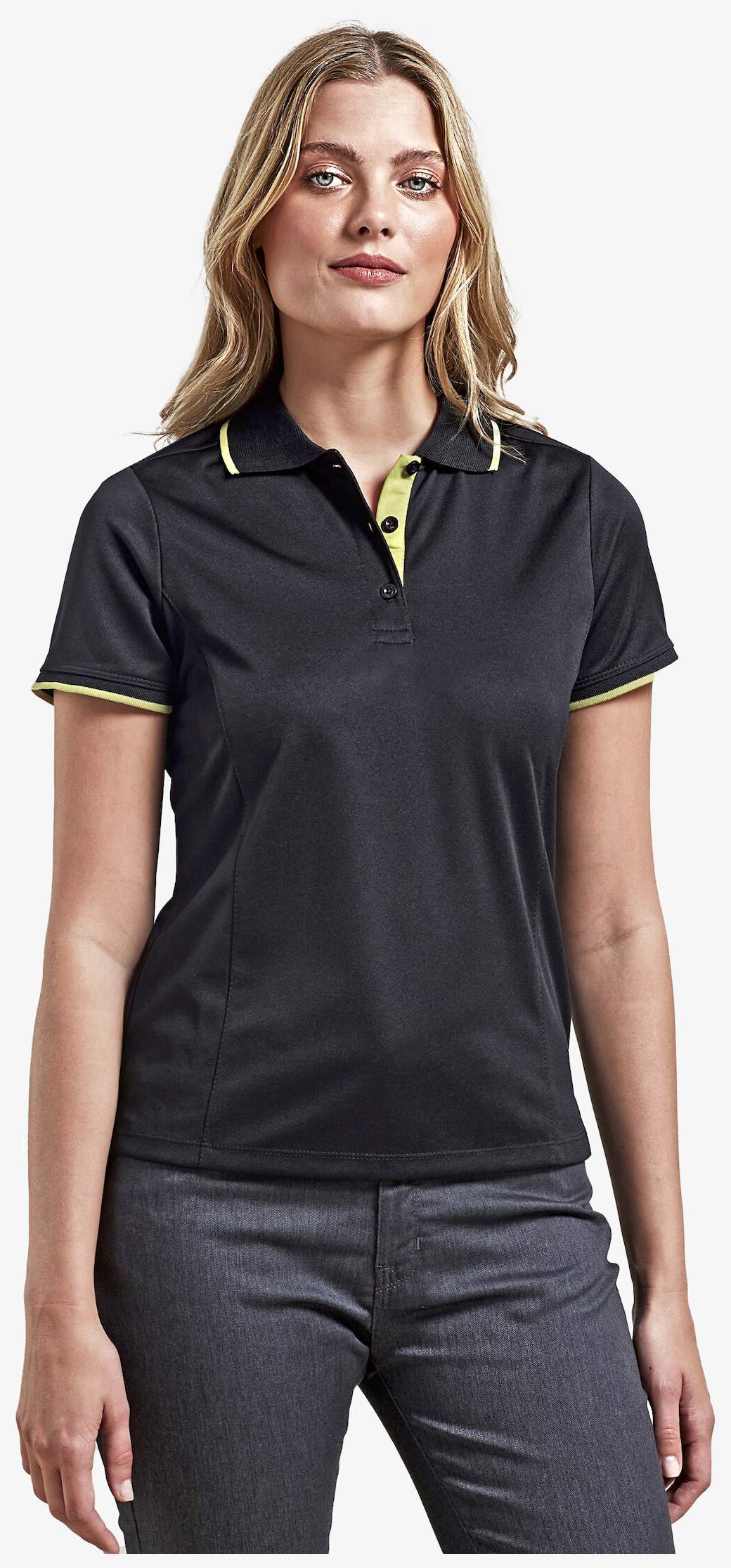 El polo de contraste para mujer está confeccionado en piqué de poliéster con paneles laterales para un corte ajustado, tapeta con tres botones, puños y cuello acanalados y aberturas laterales. El tejido Coolchecker® favorece la evaporación rápida del sudor y asegura una buena circulación del aire.