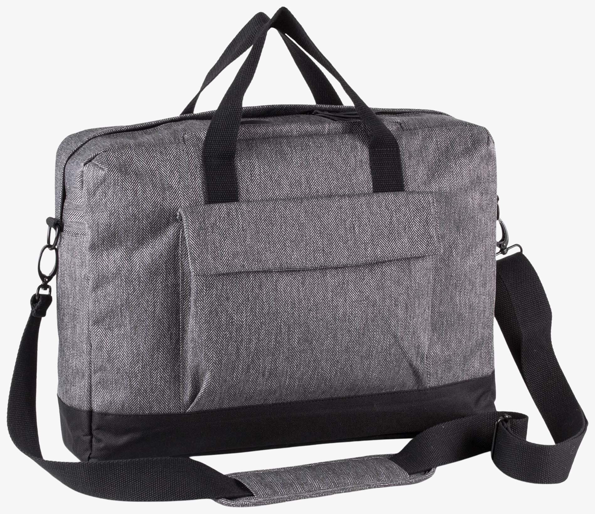 La bolsa porta ordenador está confeccionada en poliéster 600D con base en contraste. Dispone de un compartimento acolchado para ordenador de hasta 15 pulgadas, así como un bolsillo acolchado con cremallera para tableta. La bolsa también incluye dos bolsillos interiores, un bolsillo superior con cremallera para teléfono móvil y un bolsillo frontal con solapa y cierre de botones a presión. Cuenta con una correa de hombro desmontable y una anilla trasera para fijación a trolley.