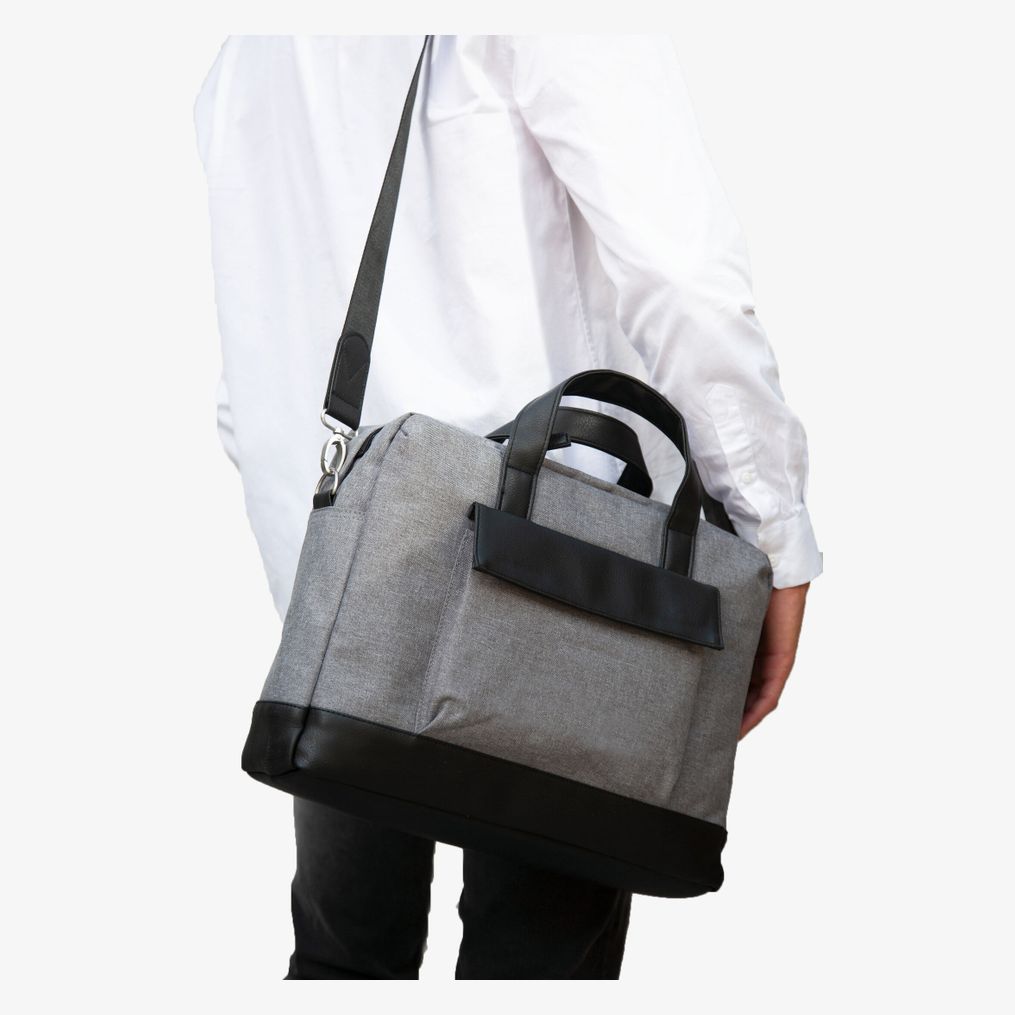 La bolsa portaordenador está confeccionada en poliéster 600D con base, asas y solapa en poliuretano. Incluye un compartimento acolchado para ordenador hasta 15 pulgadas y un bolsillo acolchado con cremallera para tableta. Dispone de dos bolsillos interiores, un bolsillo superior con cremallera para teléfono y un bolsillo delantero con solapa y cierres a presión. La parte trasera tiene una cinta para fijación trolley y la correa de hombro es desmontable.