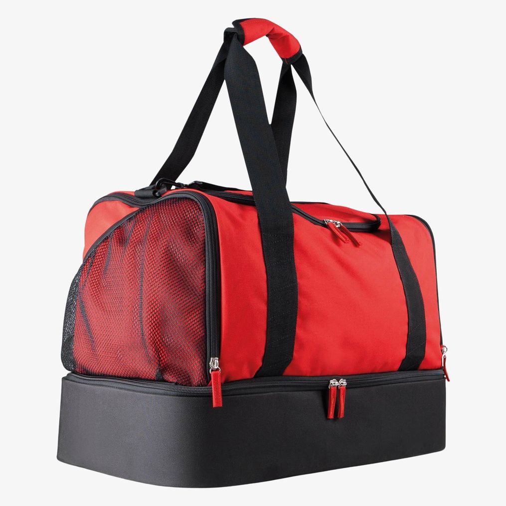 El sac sport collectif está confeccionado en poliéster 600D con una base rígida. Cuenta con varias aberturas con cremallera, una correa de hombro reforzada y desmontable y grandes bolsillos laterales, uno de ellos de malla.