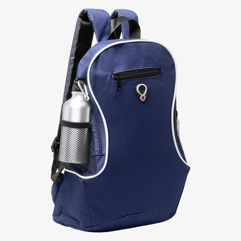 La mochila de poliéster incluye asas ajustables y un asa superior para colgar. Cuenta con un bolsillo frontal con cierre de cremallera y bolsillos laterales de tela microperforada.
