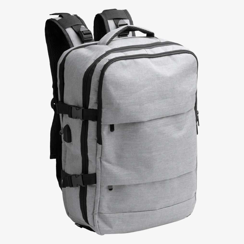 La mochila de poliéster reciclado RPET combina confort y funcionalidad gracias a su espalda y asas acolchadas, sus dos bolsillos exteriores y tres compartimentos principales. Incluye un compartimento para portátil de 17,3 pulgadas, una salida USB con cable micro USB y un compartimento ventilado para zapatillas. Un bolsillo antirrobo en la parte trasera y una correa trolley completan sus características.