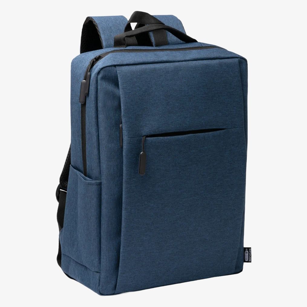 La mochila 600 D RPET cuenta con un acabado jaspeado e incluye un gran compartimento interior con bolsillo para portátil 15\". Está equipada con un bolsillo exterior con cierre de cremallera y un bolsillo lateral. Las asas están acolchadas y se incluye una correa de transporte.